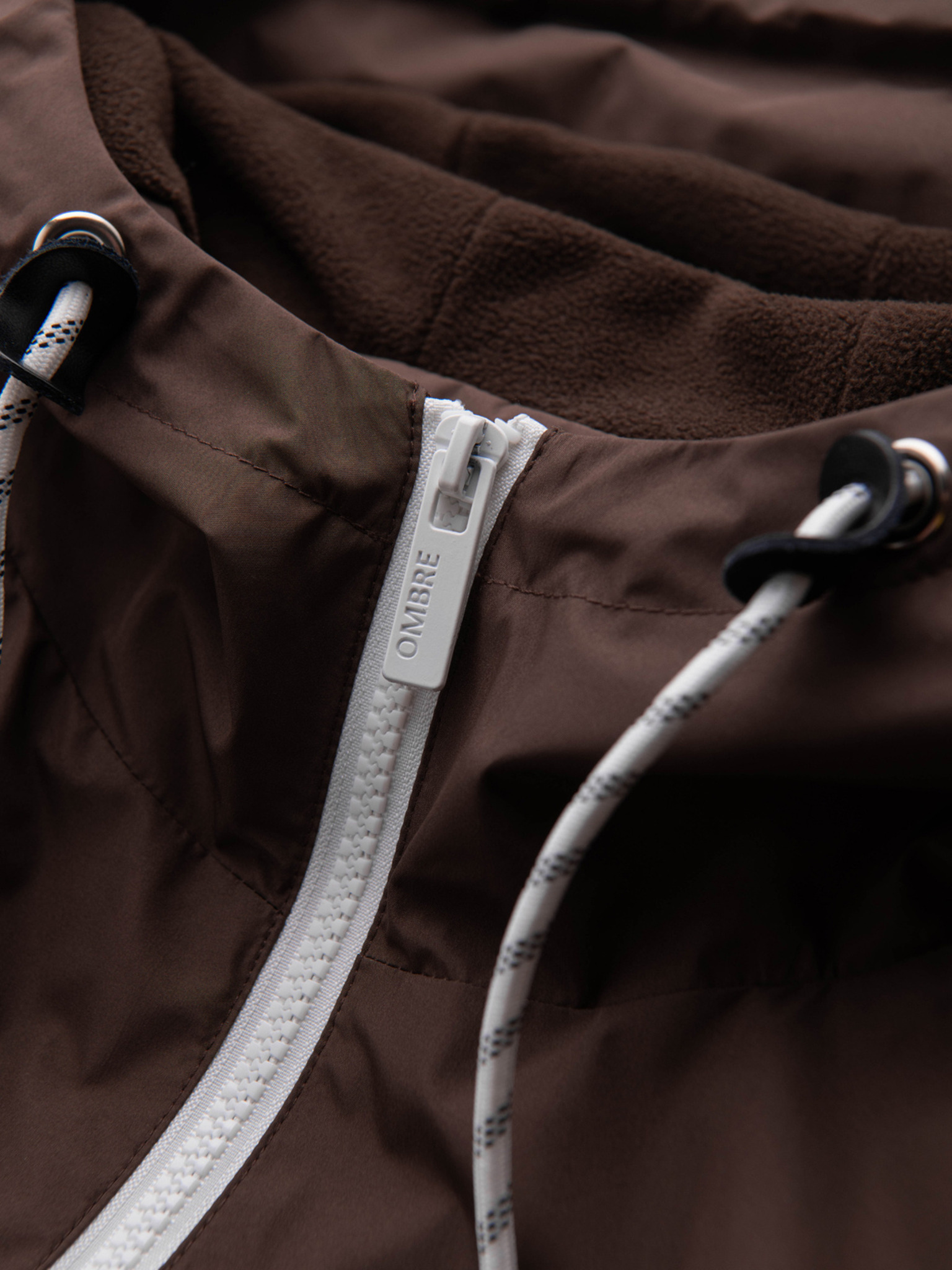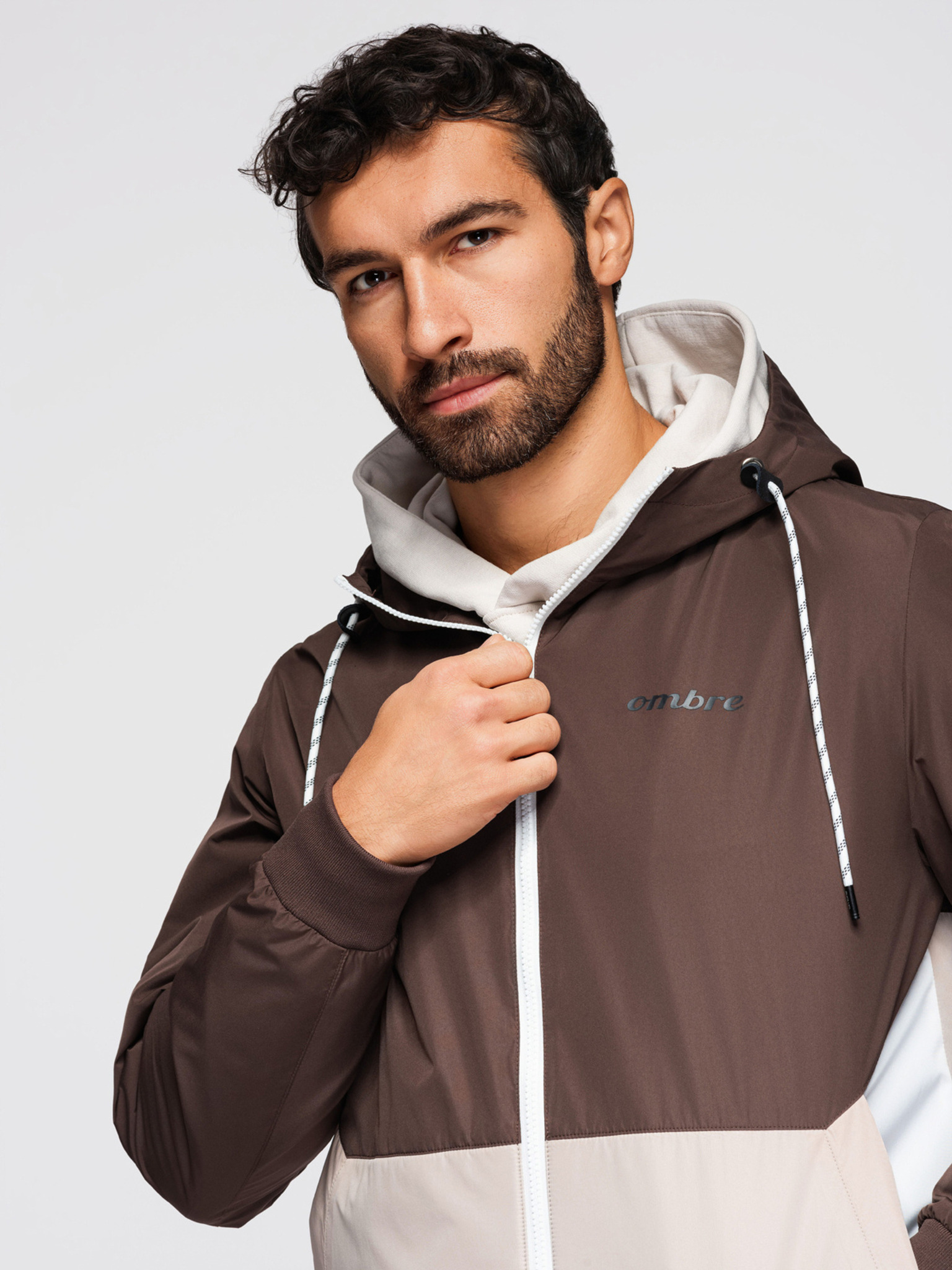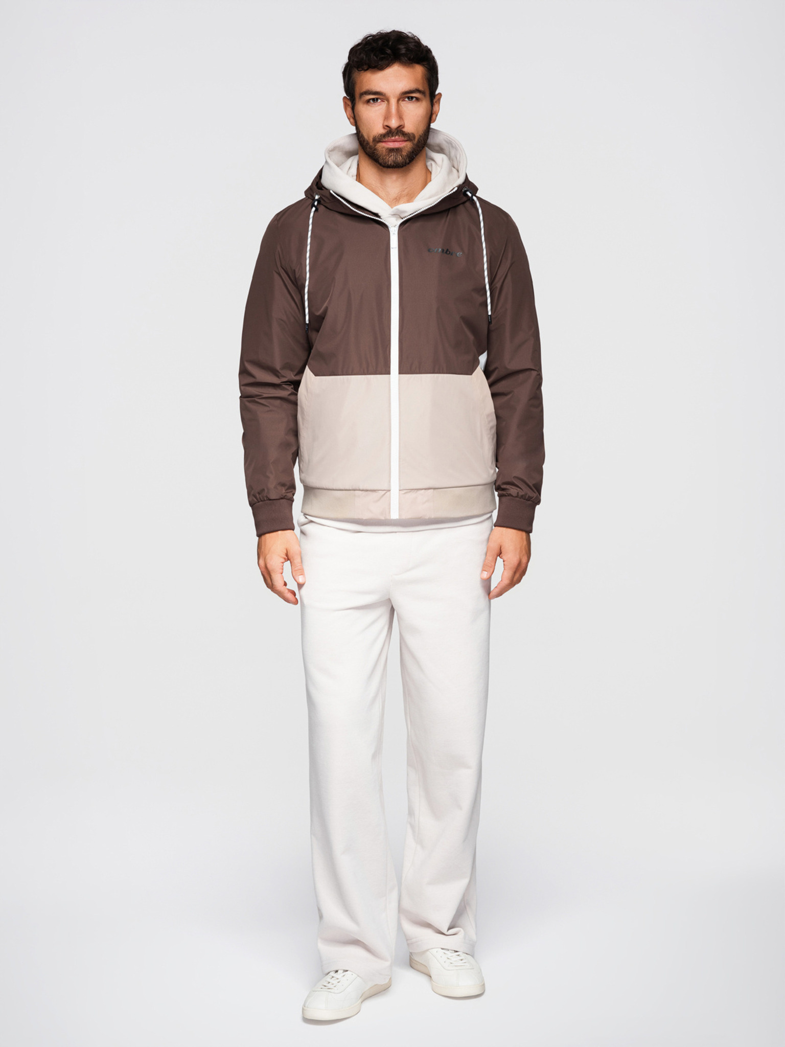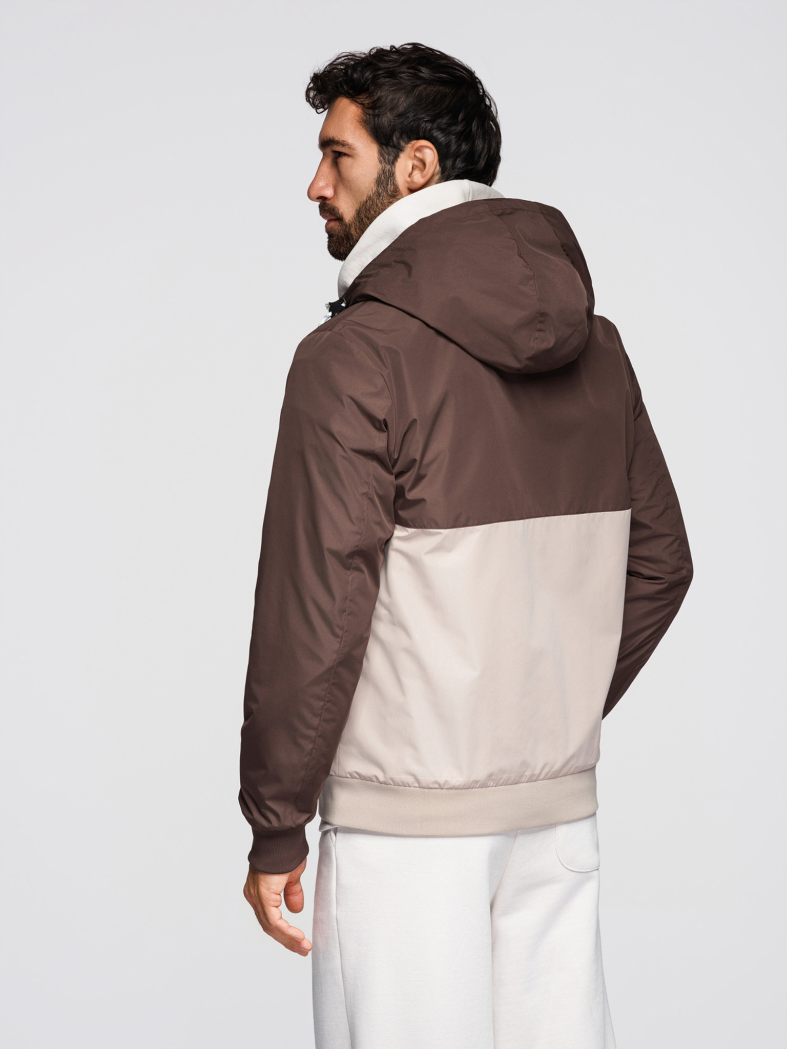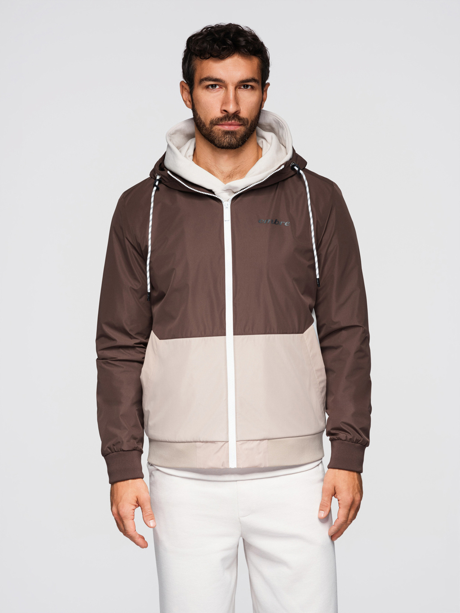 Moška lahka jakna regular fit s podlogo in kapuco - rjavo-bež V1 OM-JANP-0242 Ombre Clothing