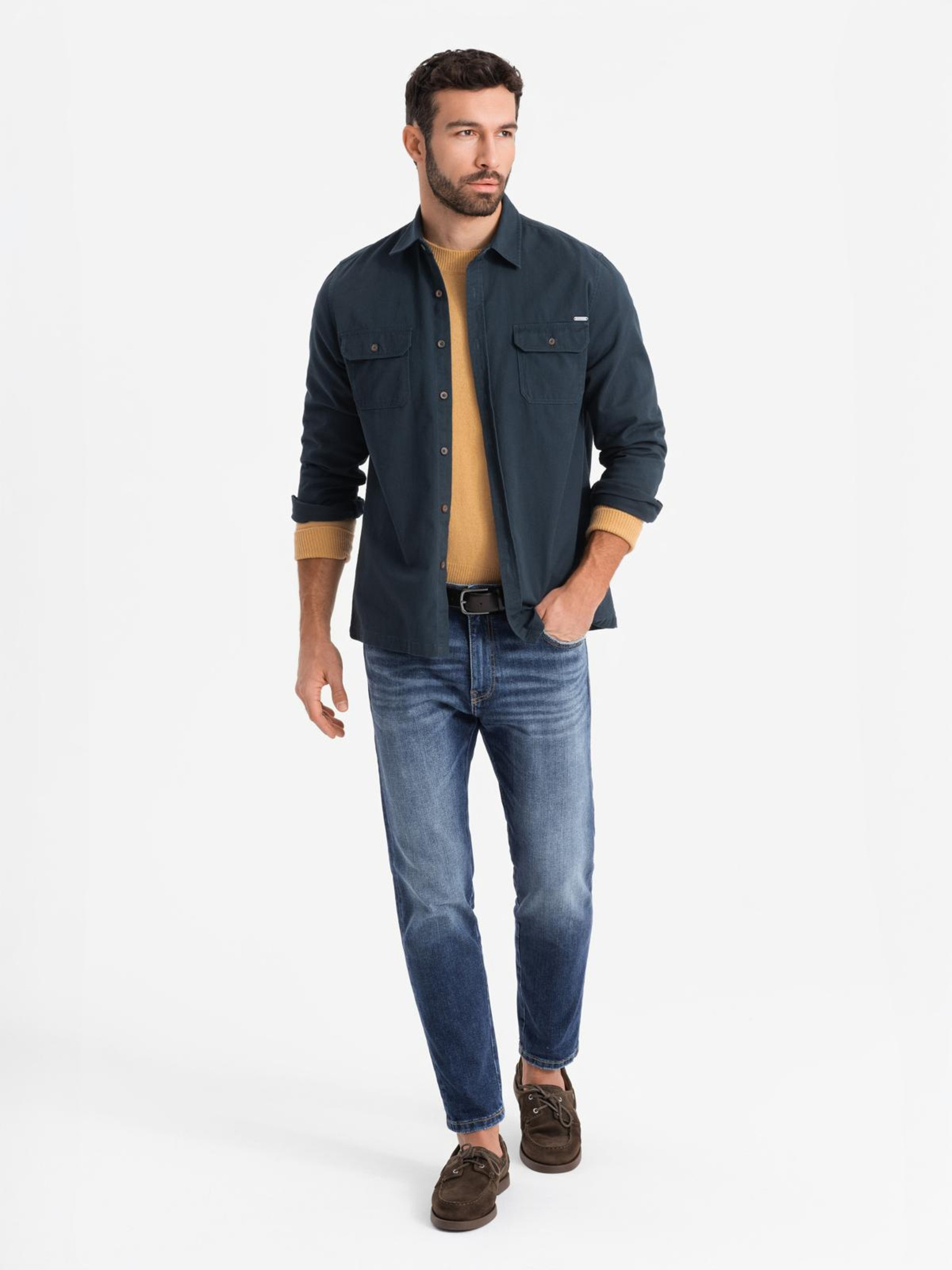 Moška jeans srajca na gumbe s žepi - modra V2 OM-SHDS-0210 Ombre Clothing
