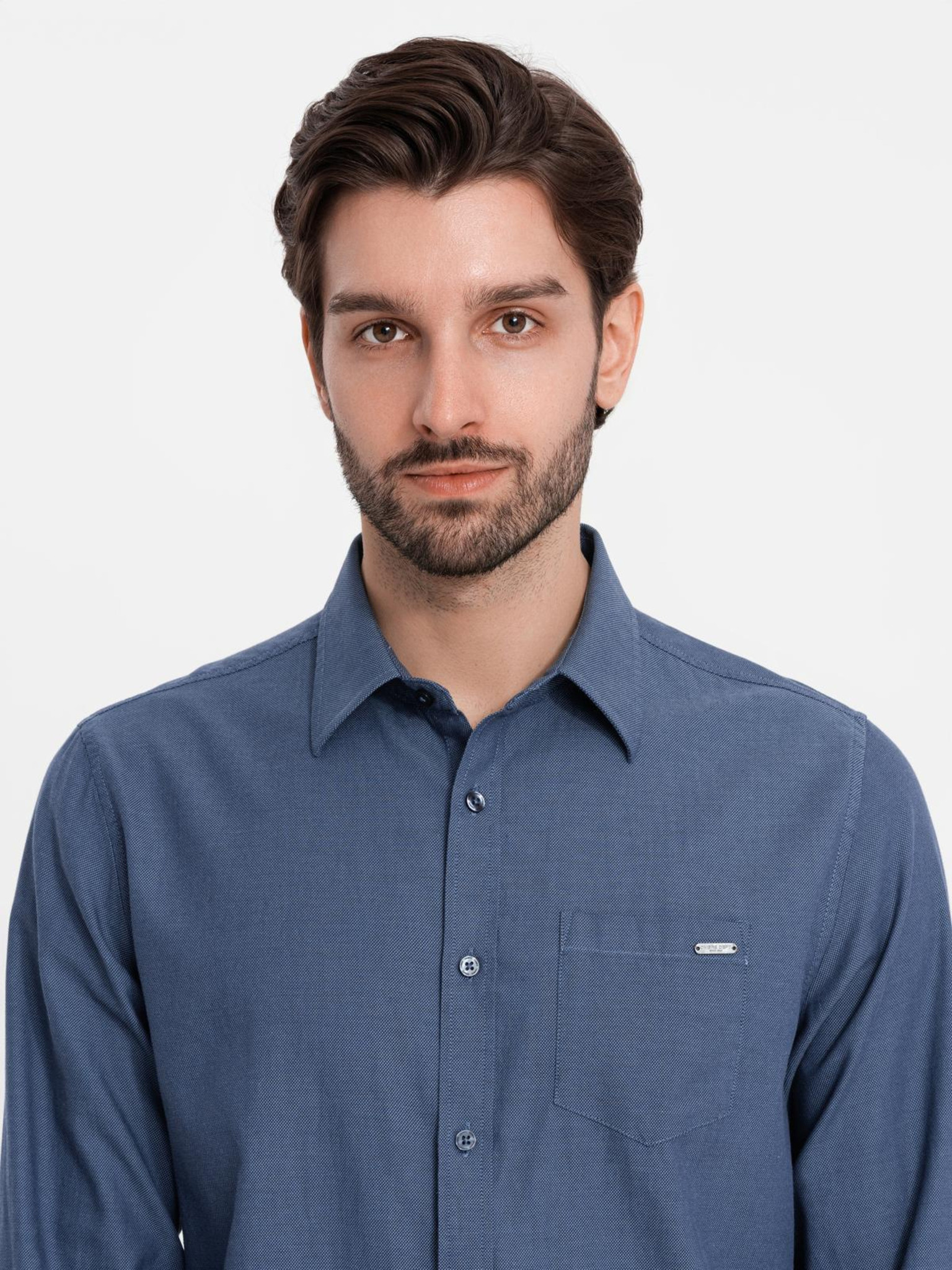 Moška jeans srajca na gumbe s žepi - modra V2 OM-SHDS-0210 Ombre Clothing