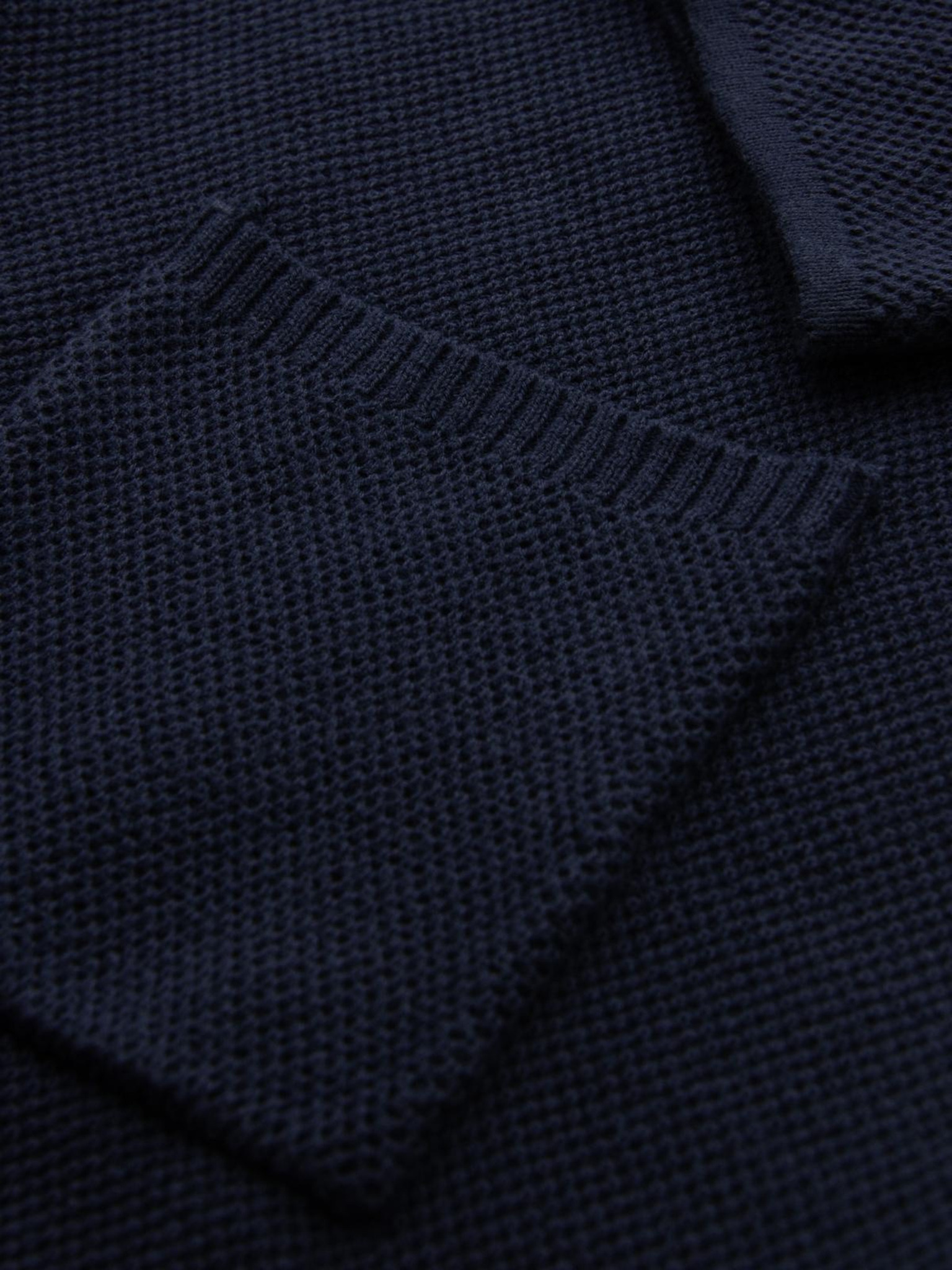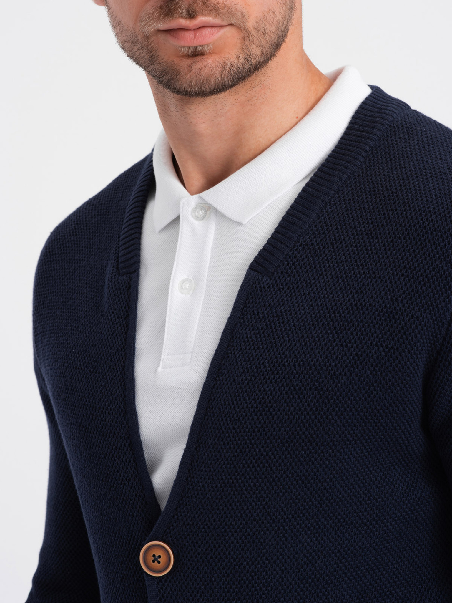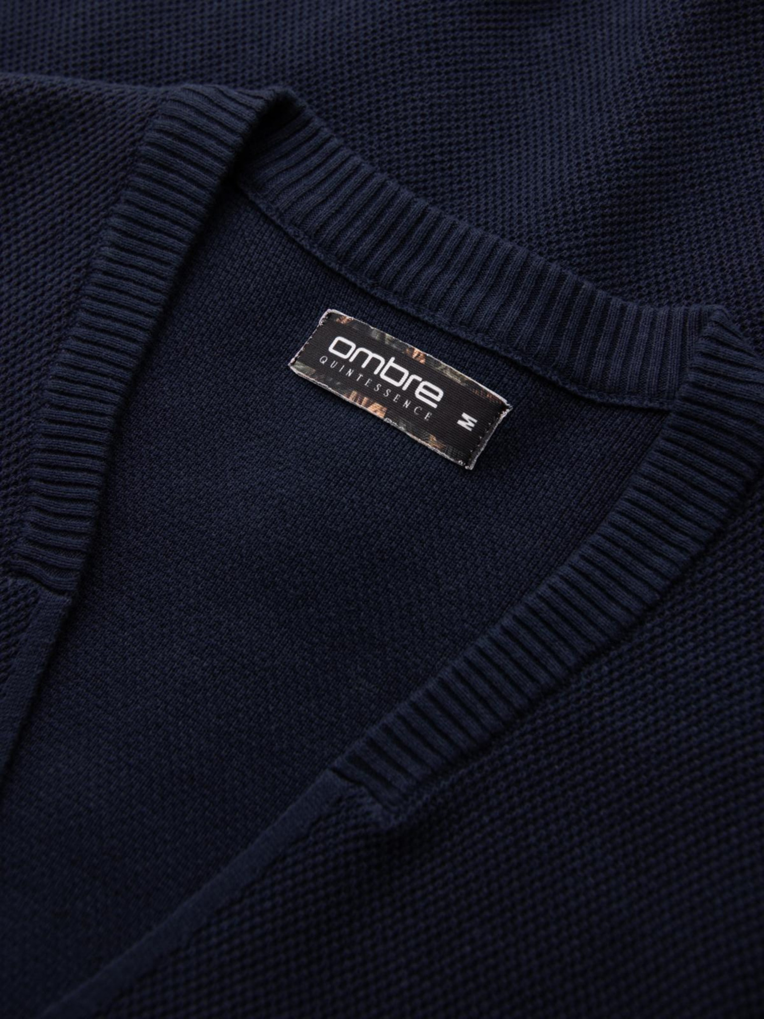 Moški pleteni pulover s strukturiranimi pikami - temno modra barva Ombre Clothing