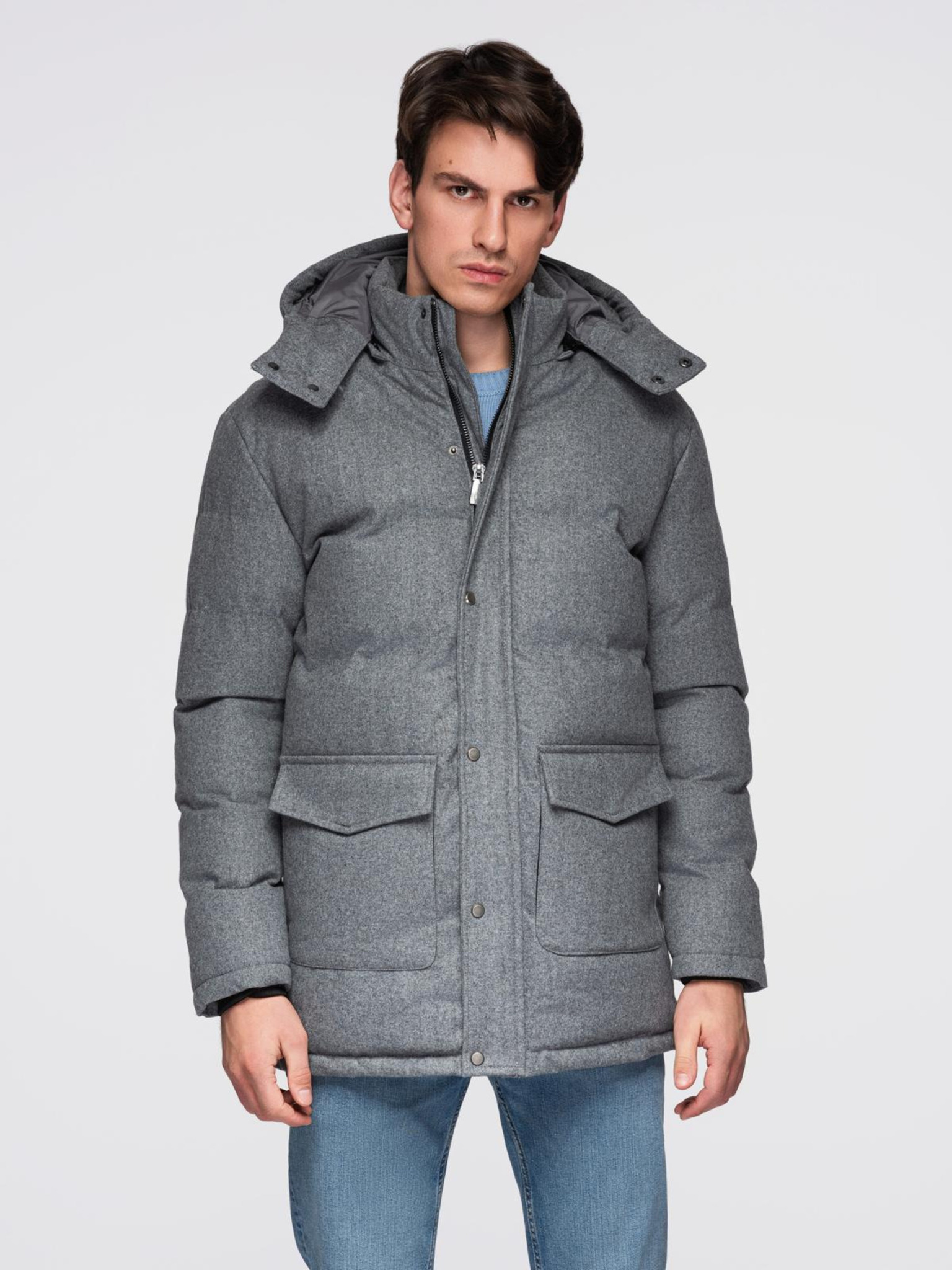 Moška jakna parka z visokim ovratnikom in asimetričnim zapenjanjem siva Ombre oblačila