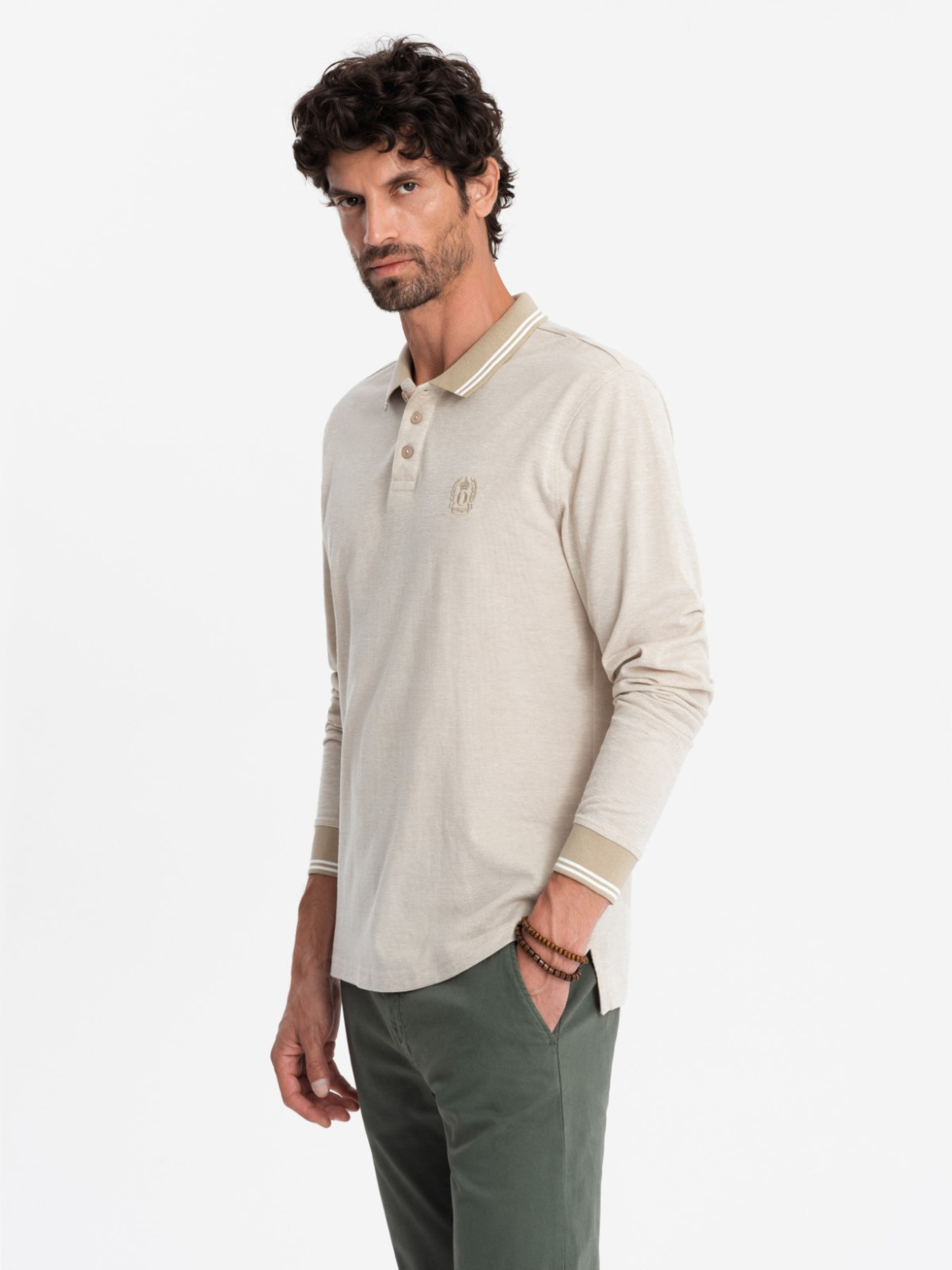 Polo srajca z dolgim rokavom in elegantnimi znamčnimi gumbi - kremna V2 OM-POLS-0139 Ombre Clothing