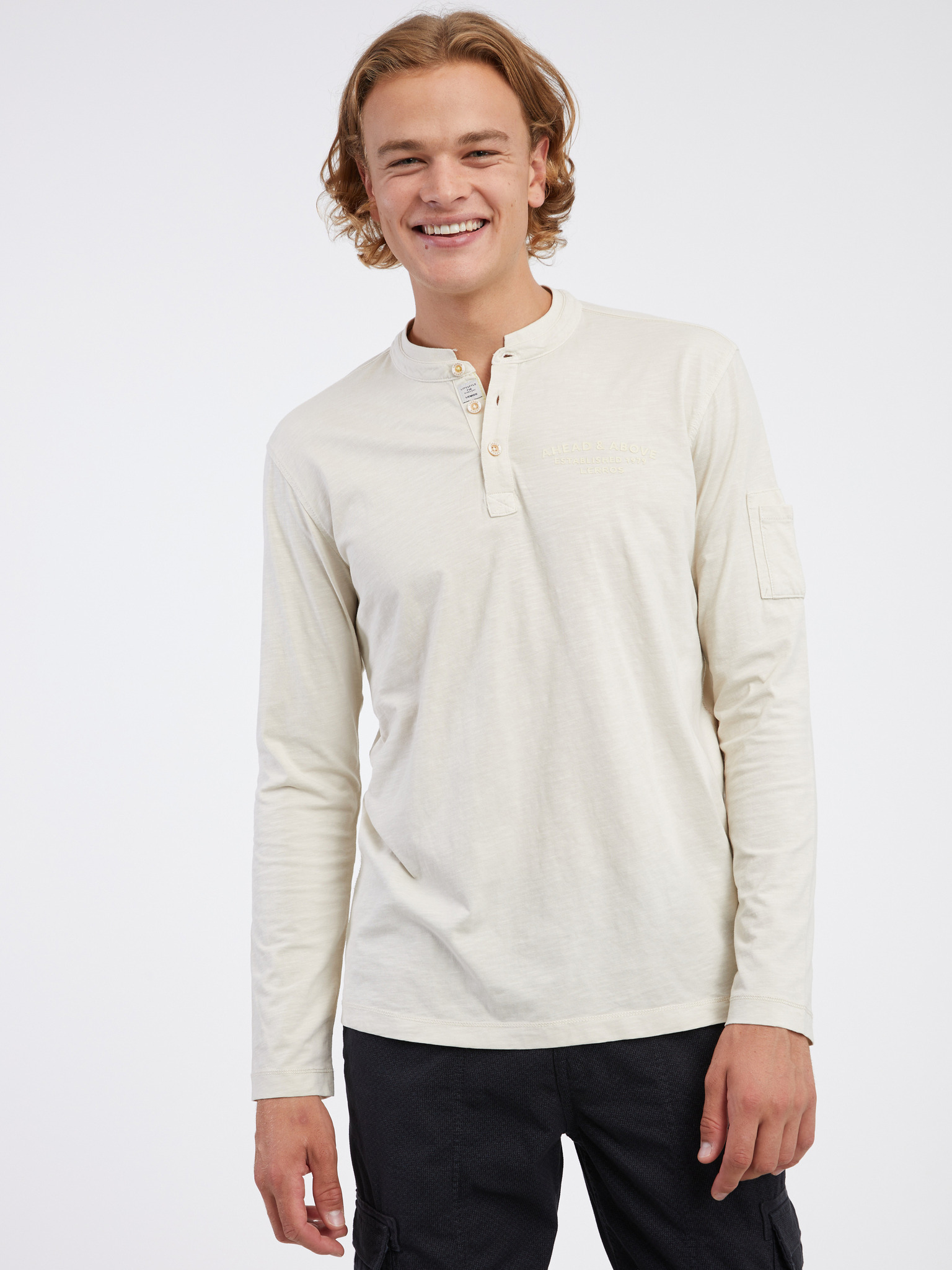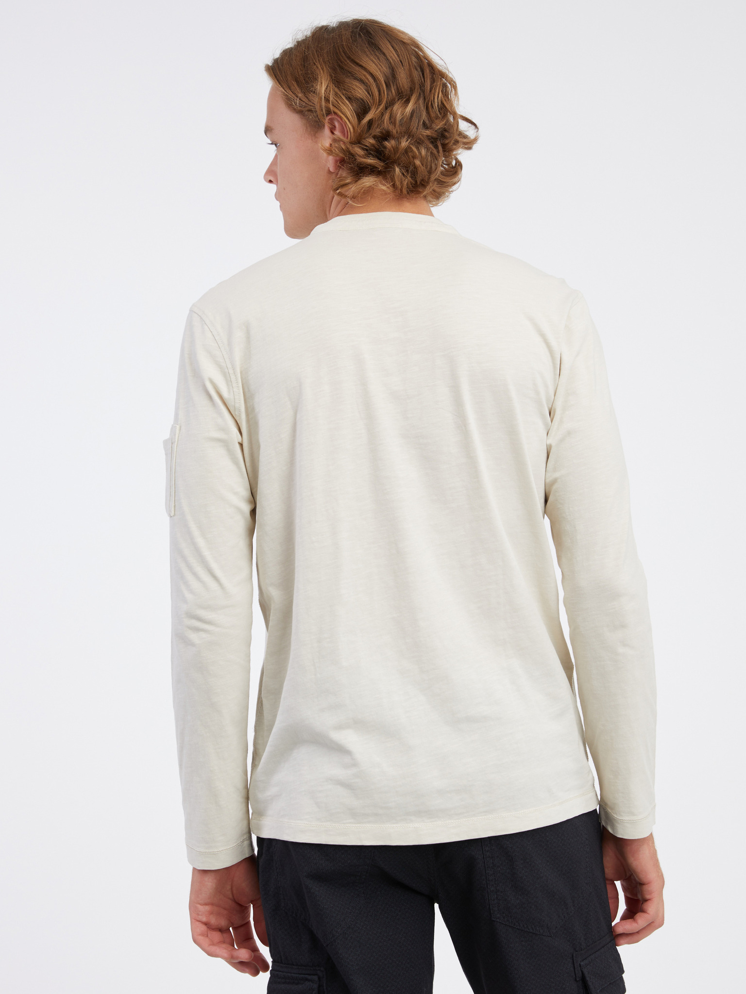 Moška bombažna majica LOOSE FIT z dolgimi rokavi in okroglim vratom - krem V2 OM-LSBC-0129 Ombre Clothing