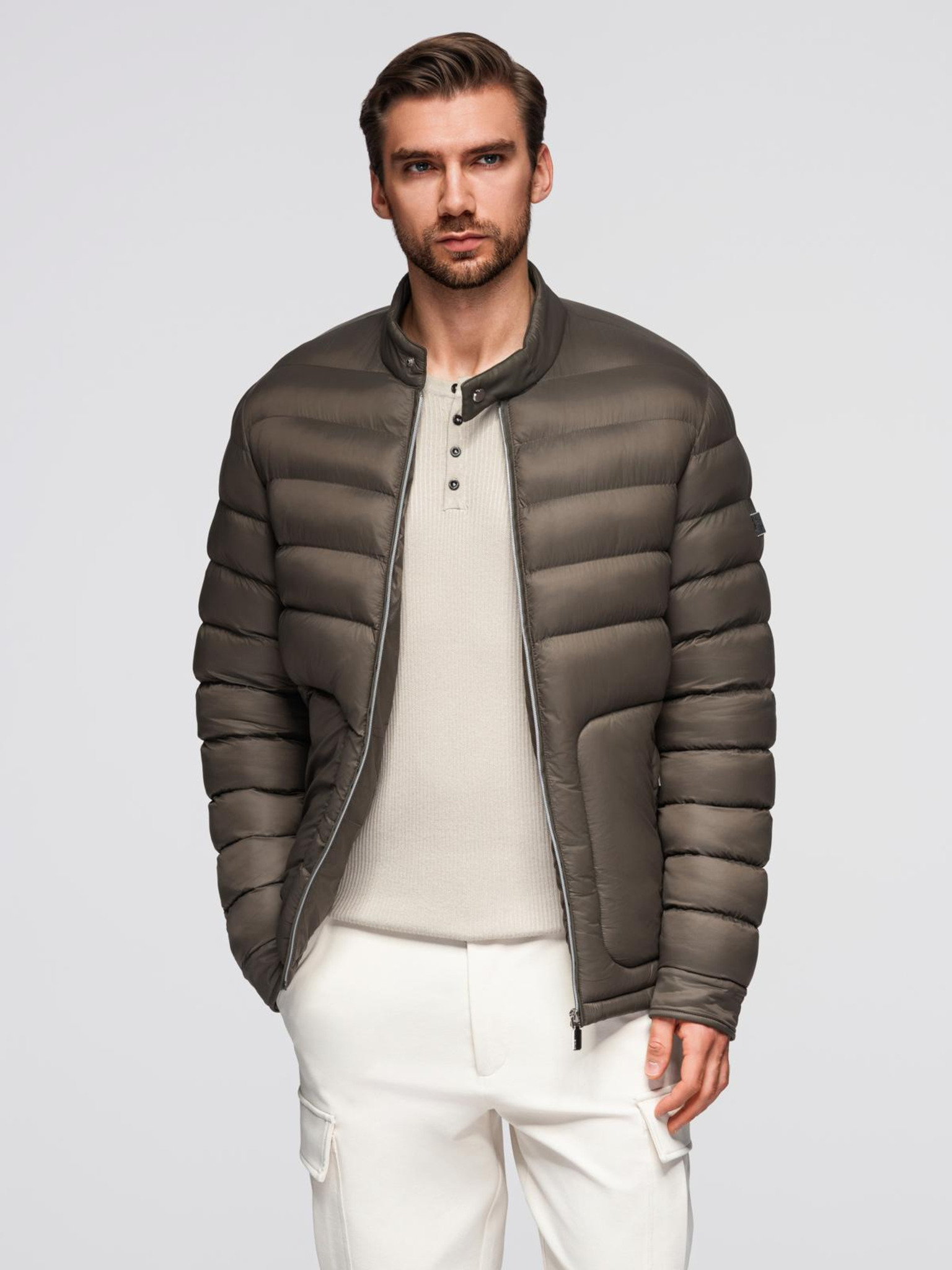 Moška prešita jakna srajčnega kroja - olivna V2 OM-JALP-0215 Ombre Clothing