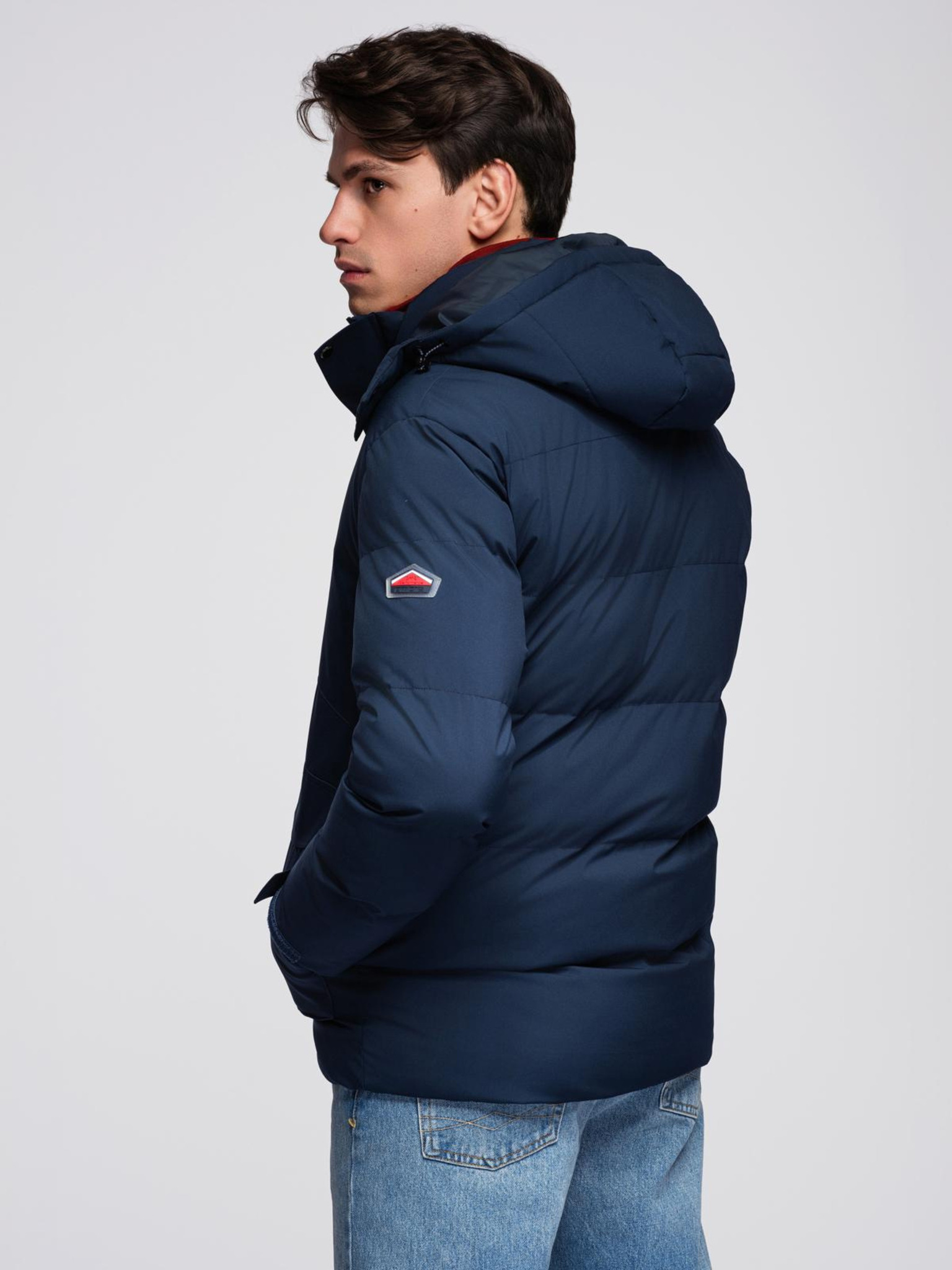 Pánska prešívaná bunda s kapuco - tmavo modrá V4 OM-JAHP-0235 Ombre Clothing