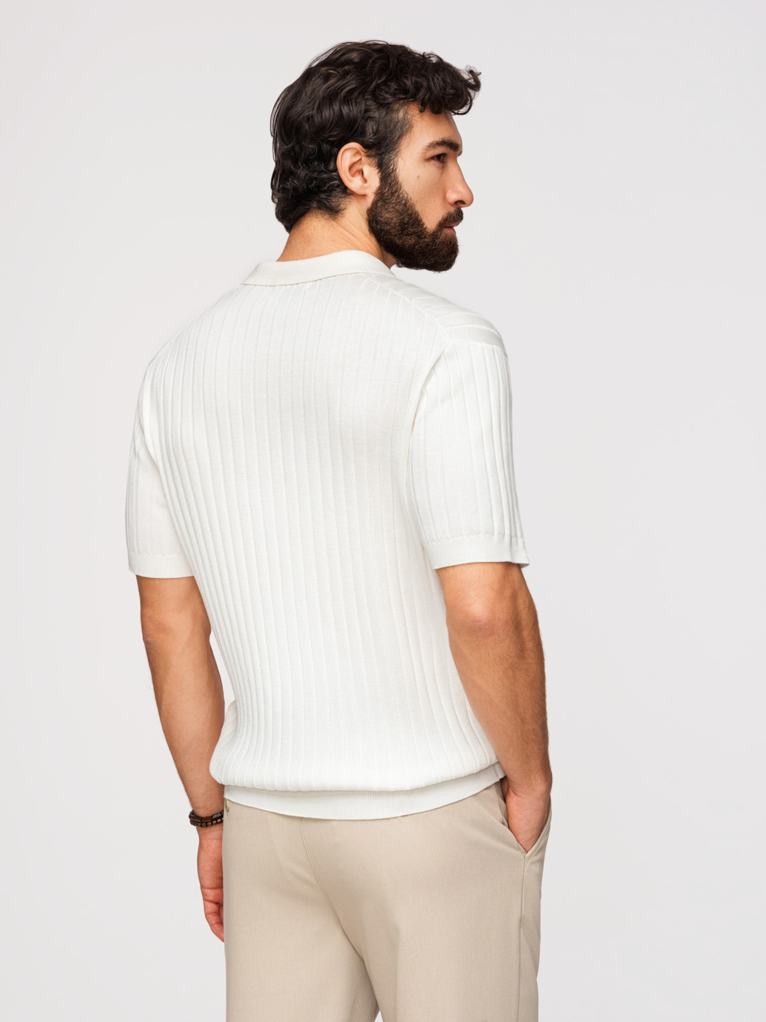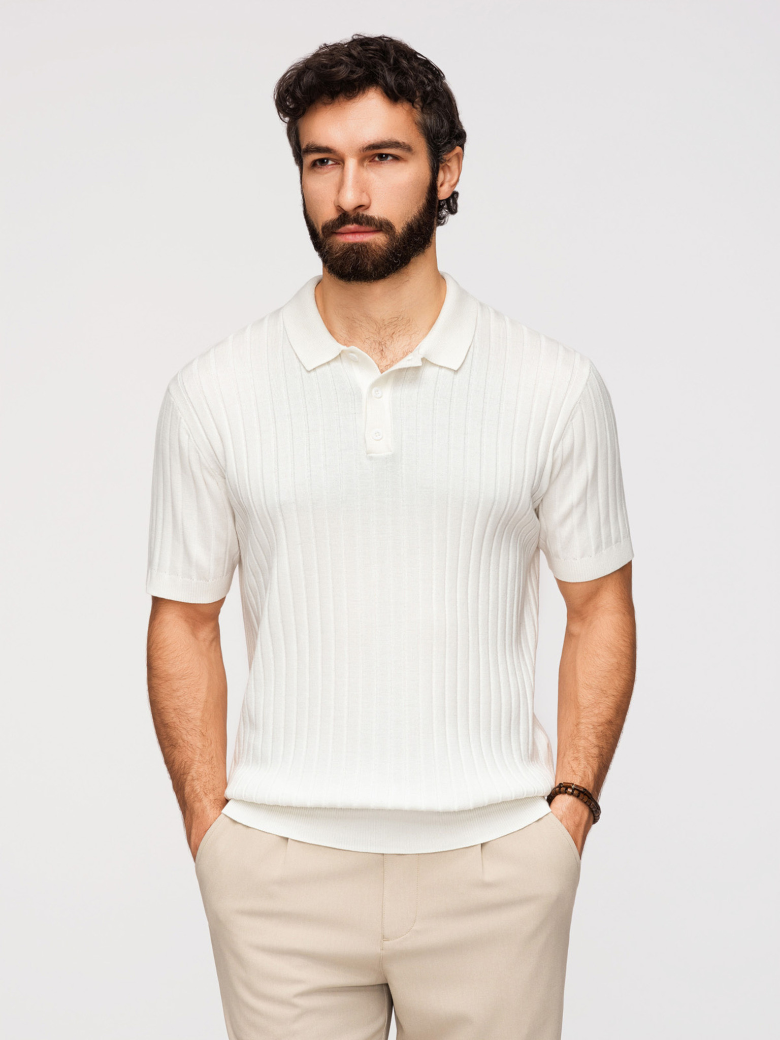 Moška stylska polo srajca iz elastične tkanine - kremasta V2 OM-POSS-0150 Ombre Clothing