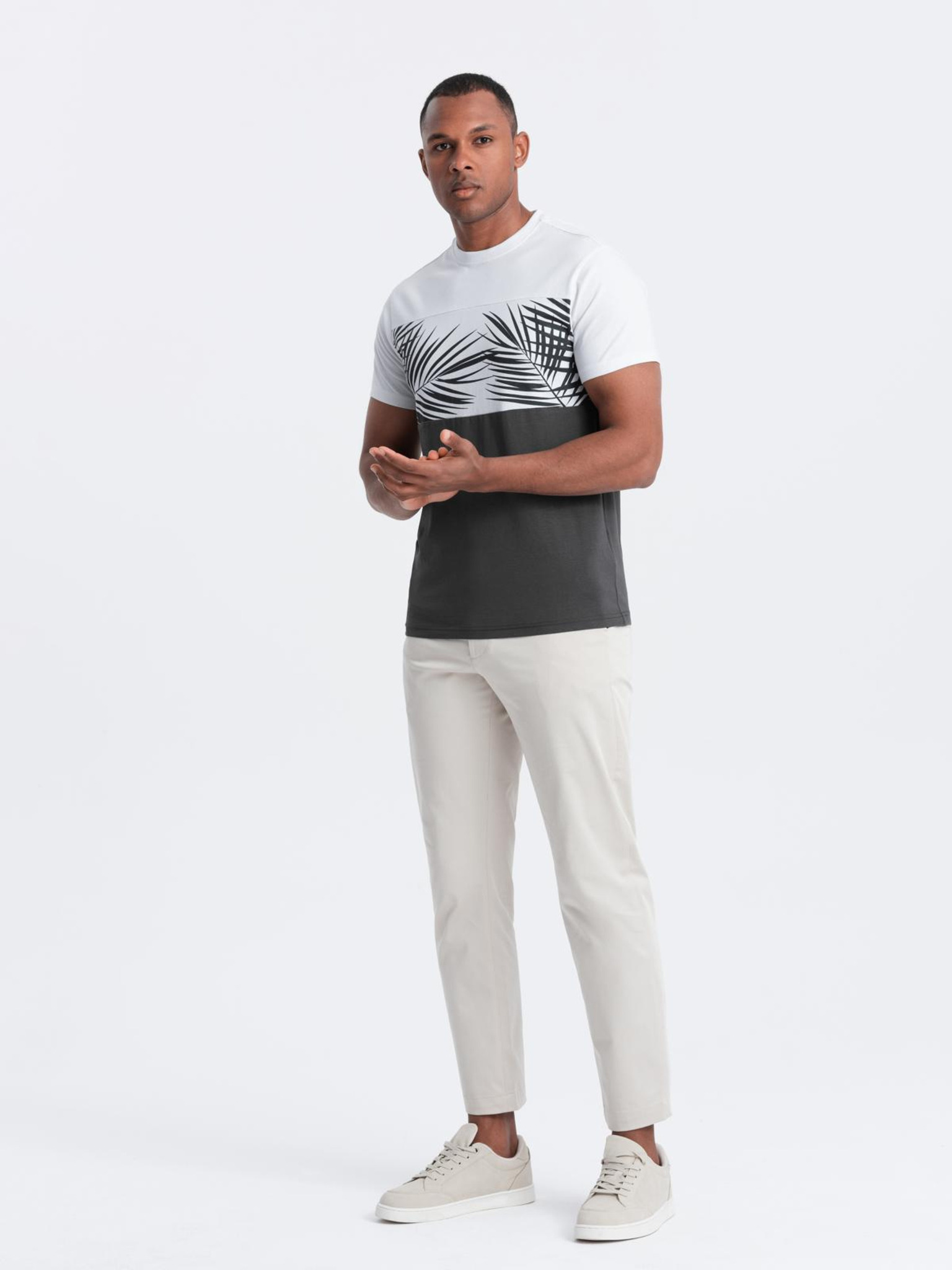Moško dvobarvno majico s potiskom palmovih listov - temno modra V1 OM-TSPT-0177 Ombre Clothing