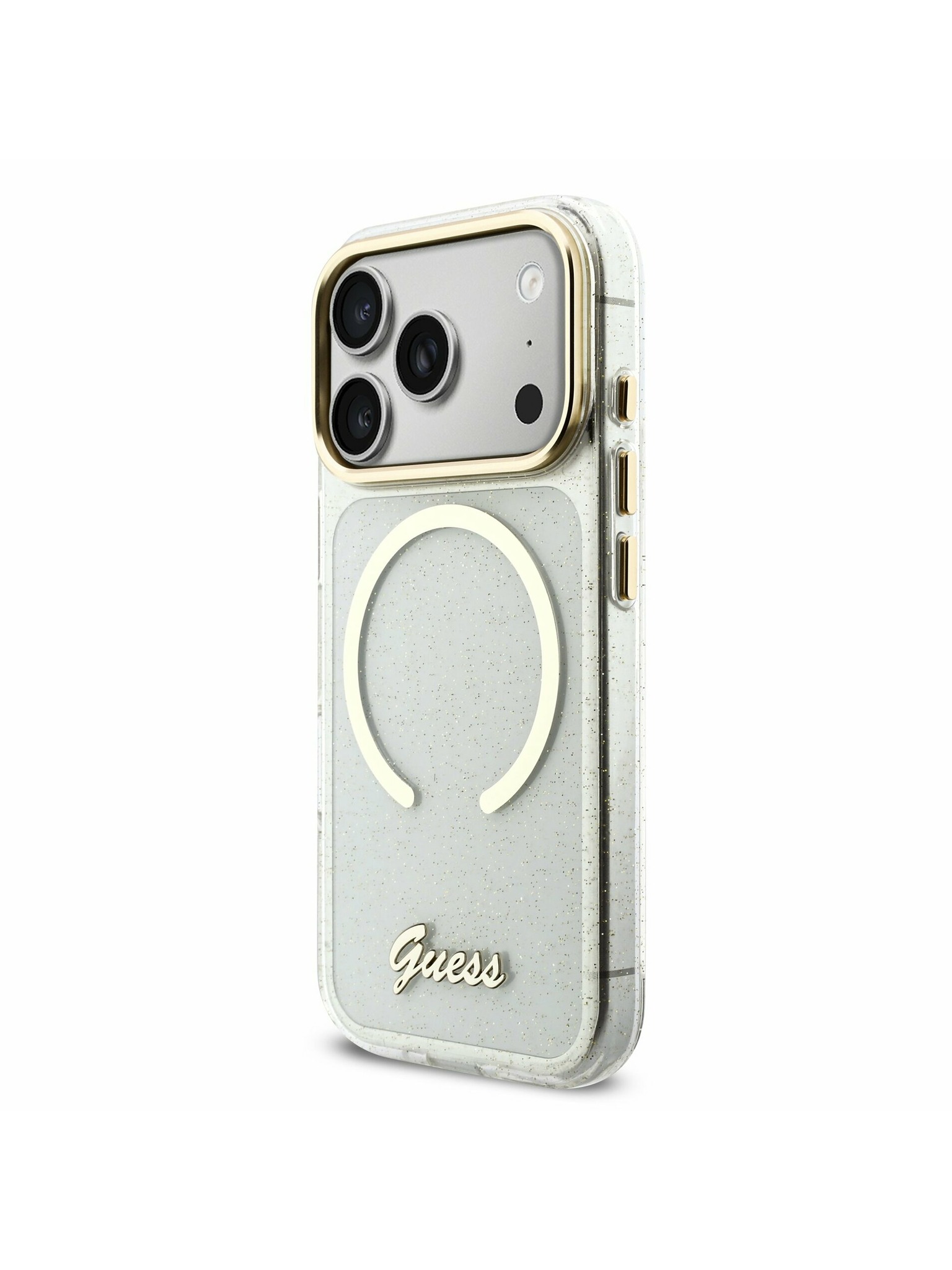 Guess IML Glitter Script Strap MagSafe Zadnji ovitek za iPhone 17 Pro Transparent