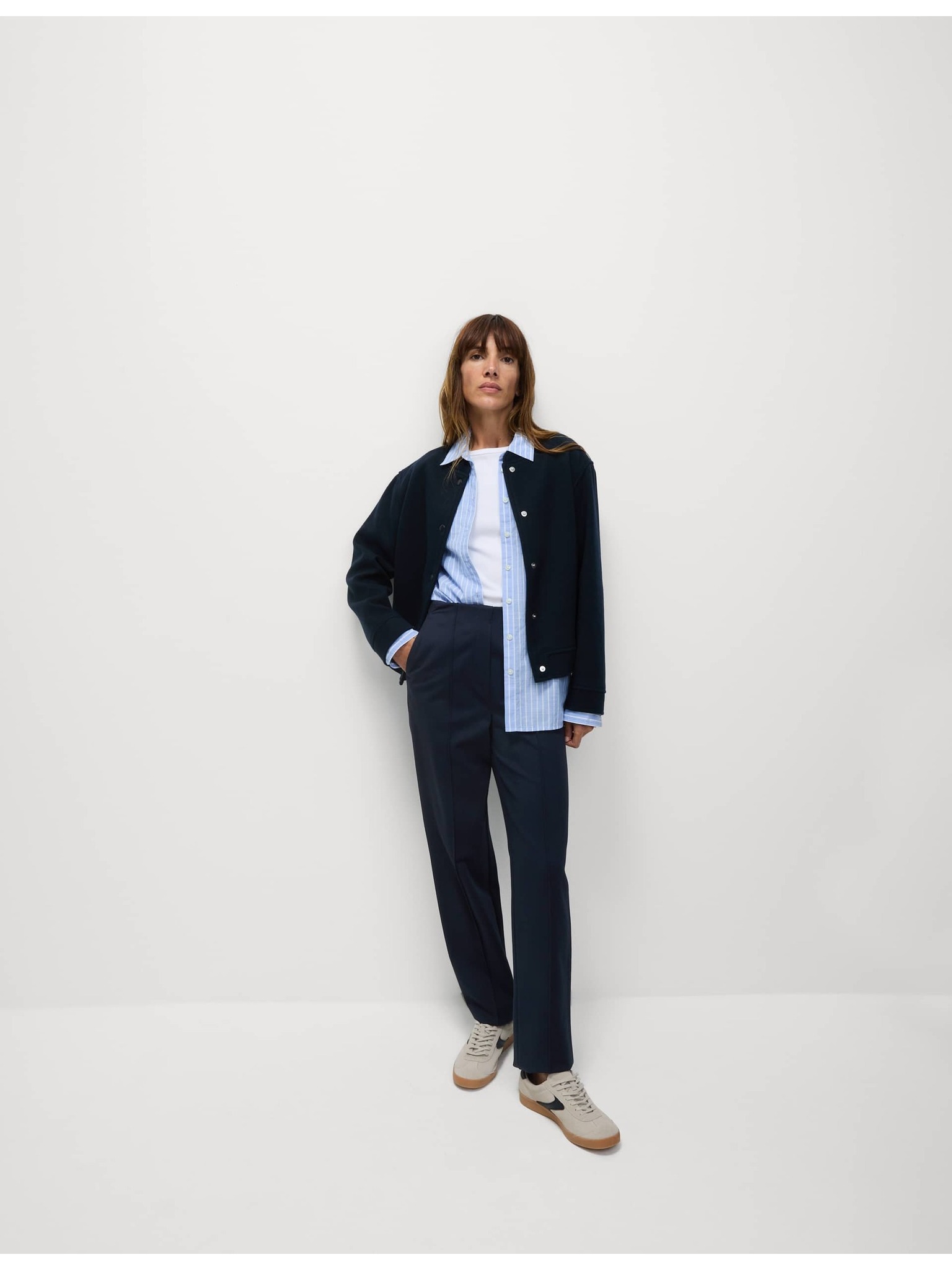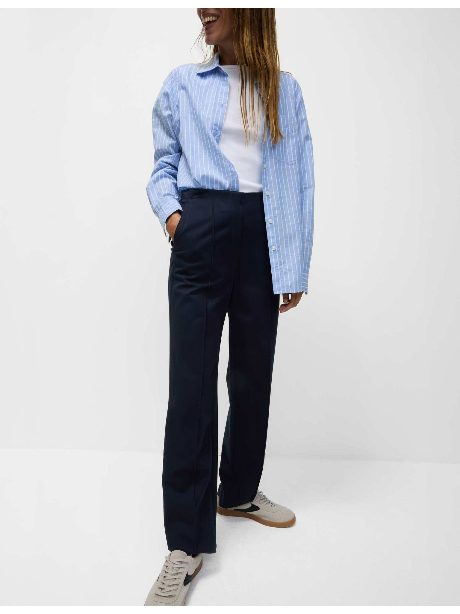 Hlače z gubanji, širokim hlačnicam in iglastimi črtami Marks & Spencer mornarsko modra