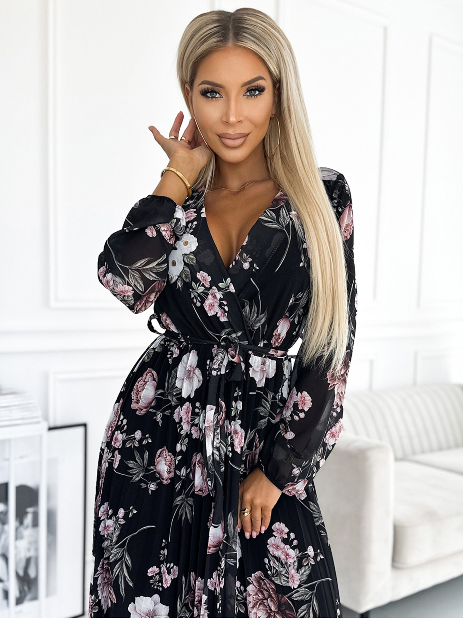 Dolga obleka z volančki - veliki rožnati cvetovi Numoco