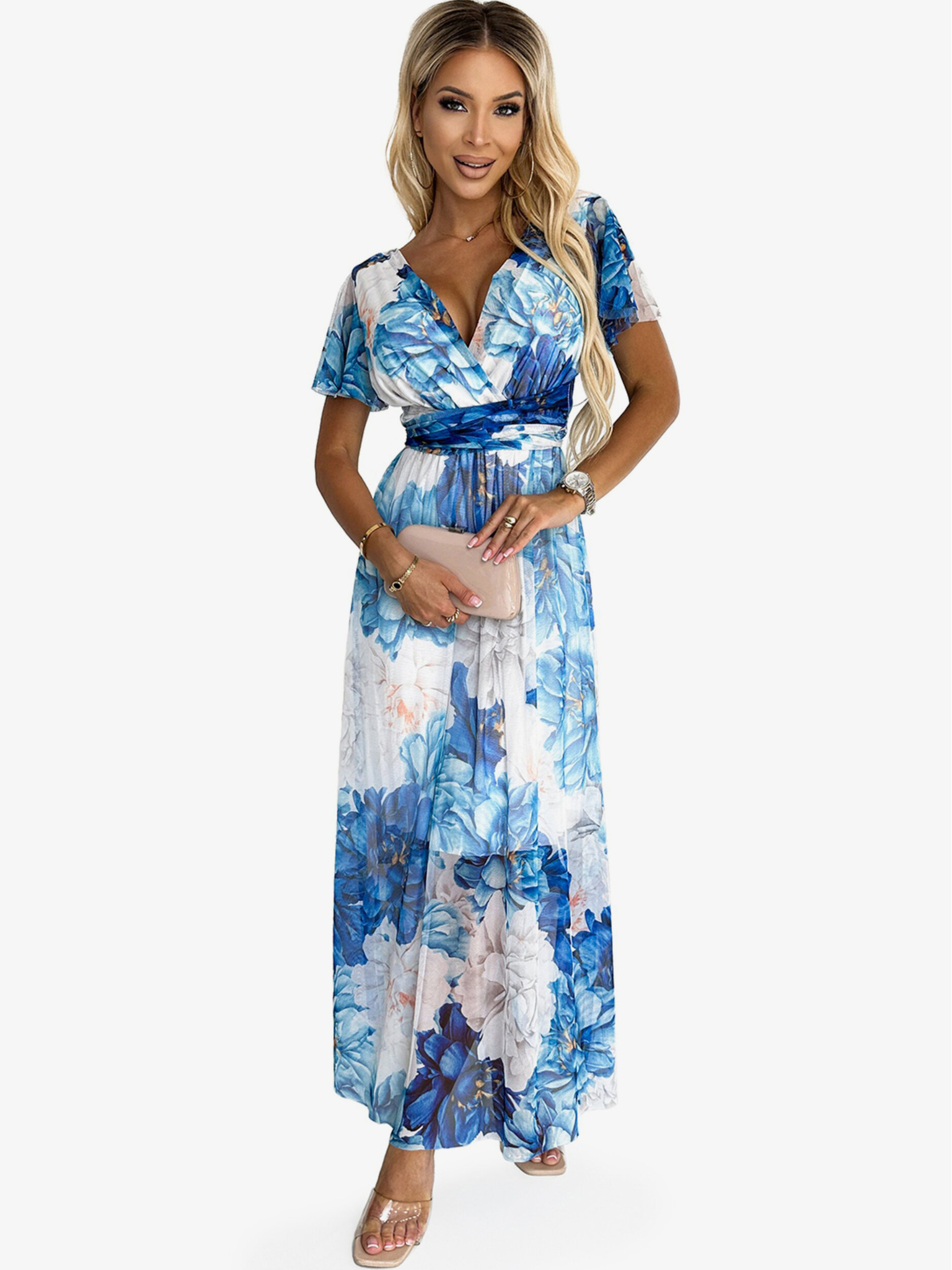 Obleka z izrezom, dolgim zavezovanjem v pasu in kratkimi rokavi - modra veliko cvetje - mrežasta Numoco CINZIA