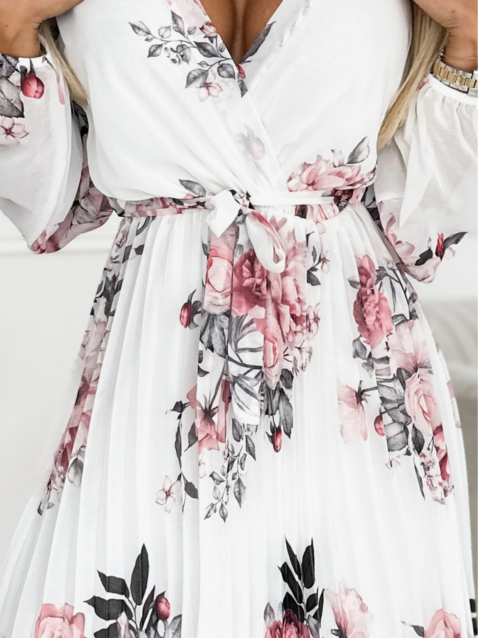 479-10 NINA elegantne obleke z V-izrezom, rokavi in pasom - sladkorno rožnate