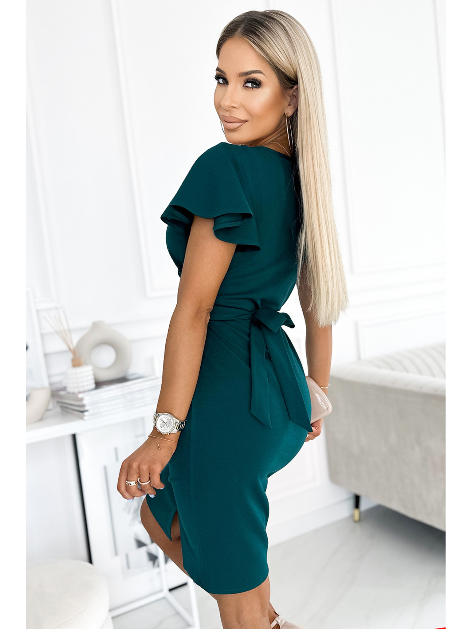 Obleka z daljšim hrbtom, izrezom in pasom - zelena Numoco MAYA