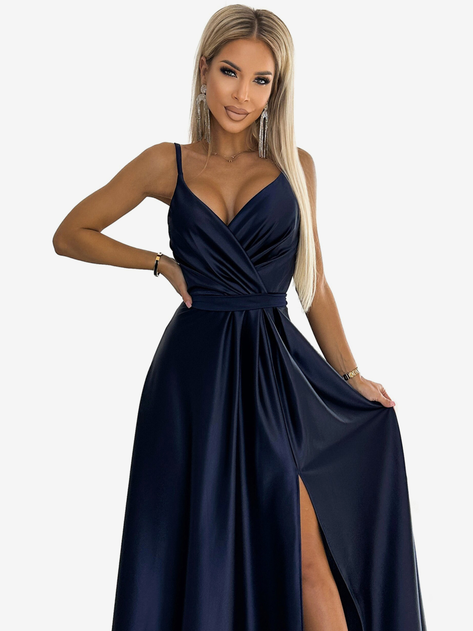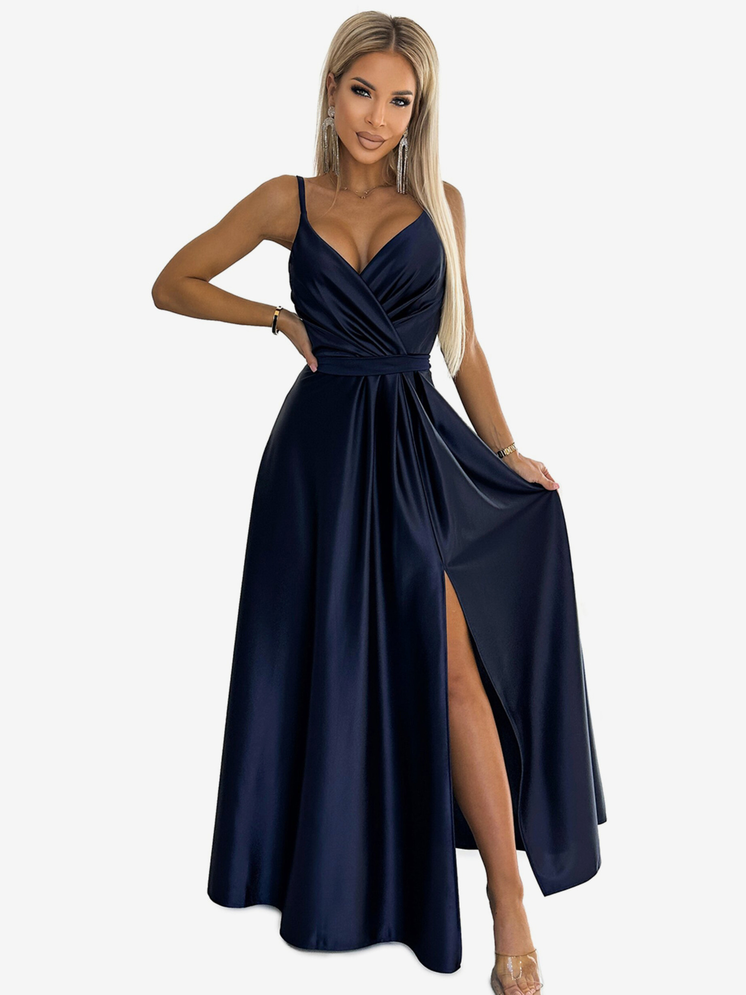 Satenska dolga obleka z izrezom - modra Numoco CRYSTAL