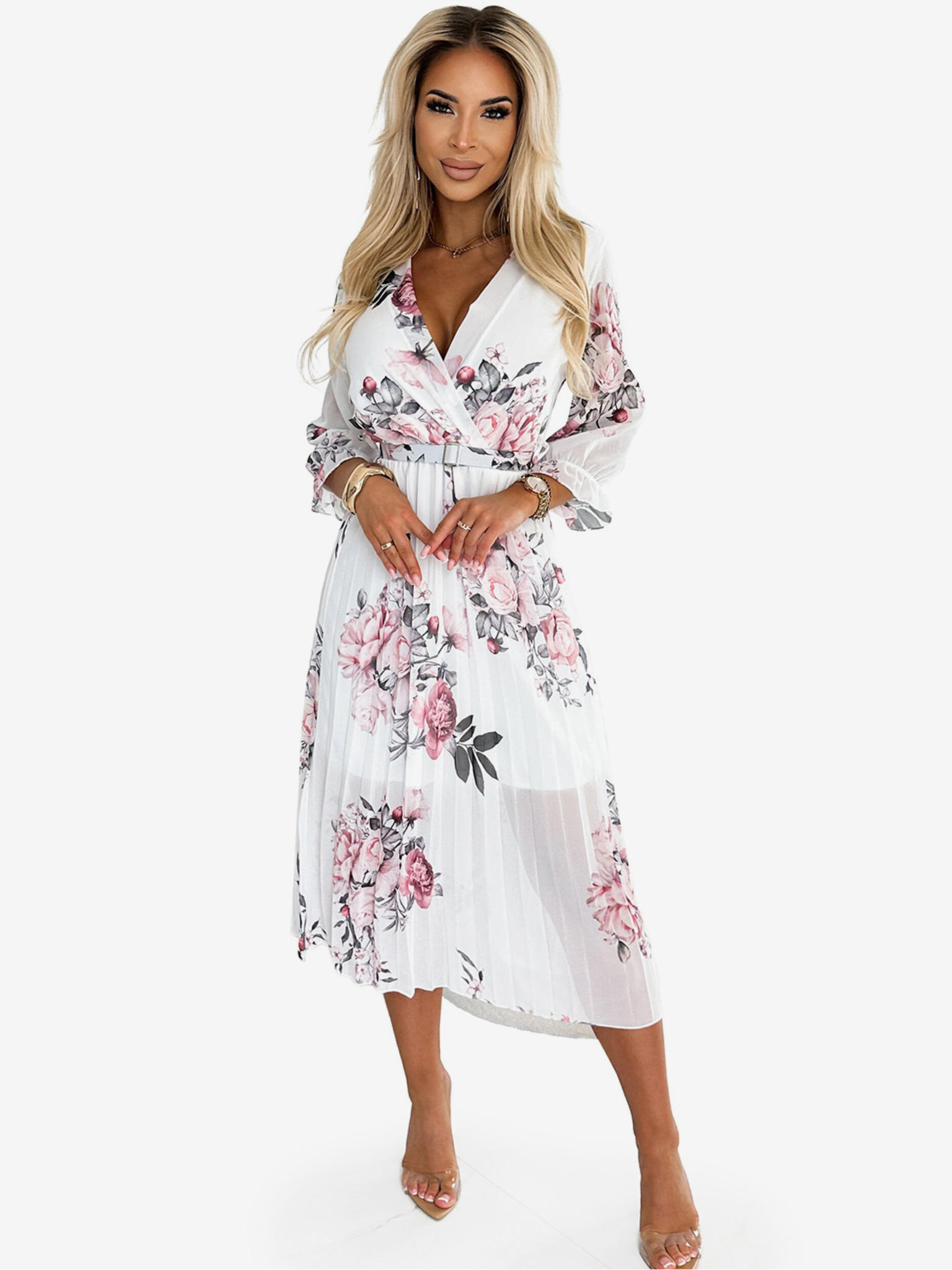 Obleka Numoco z izrezom v obliki svinčnika, rokavi in pasom