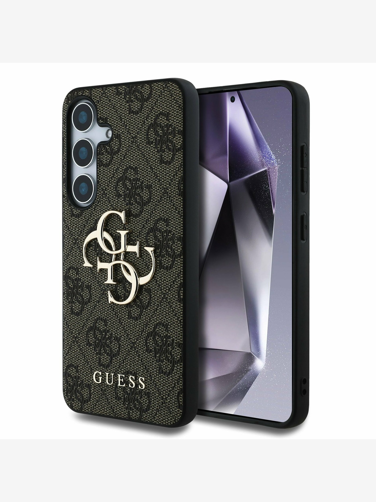 Guess PU 4G Strass Trikotni Logo Stand Zadnji ovitek za kamero MagSafe za iPhone 13 Rjav