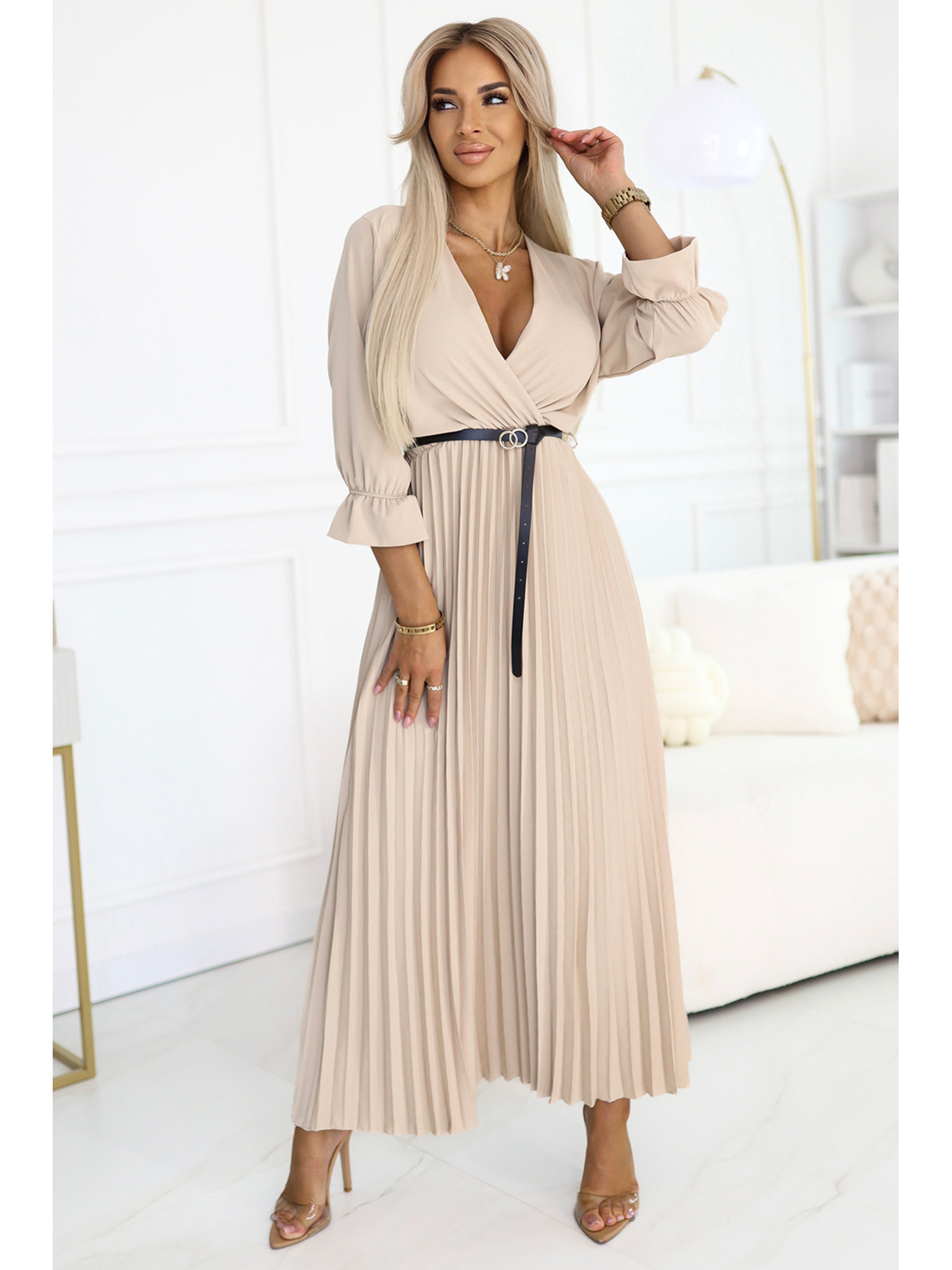 Obleka Numoco z izrezom v obliki svinčnika, rokavi in pasom