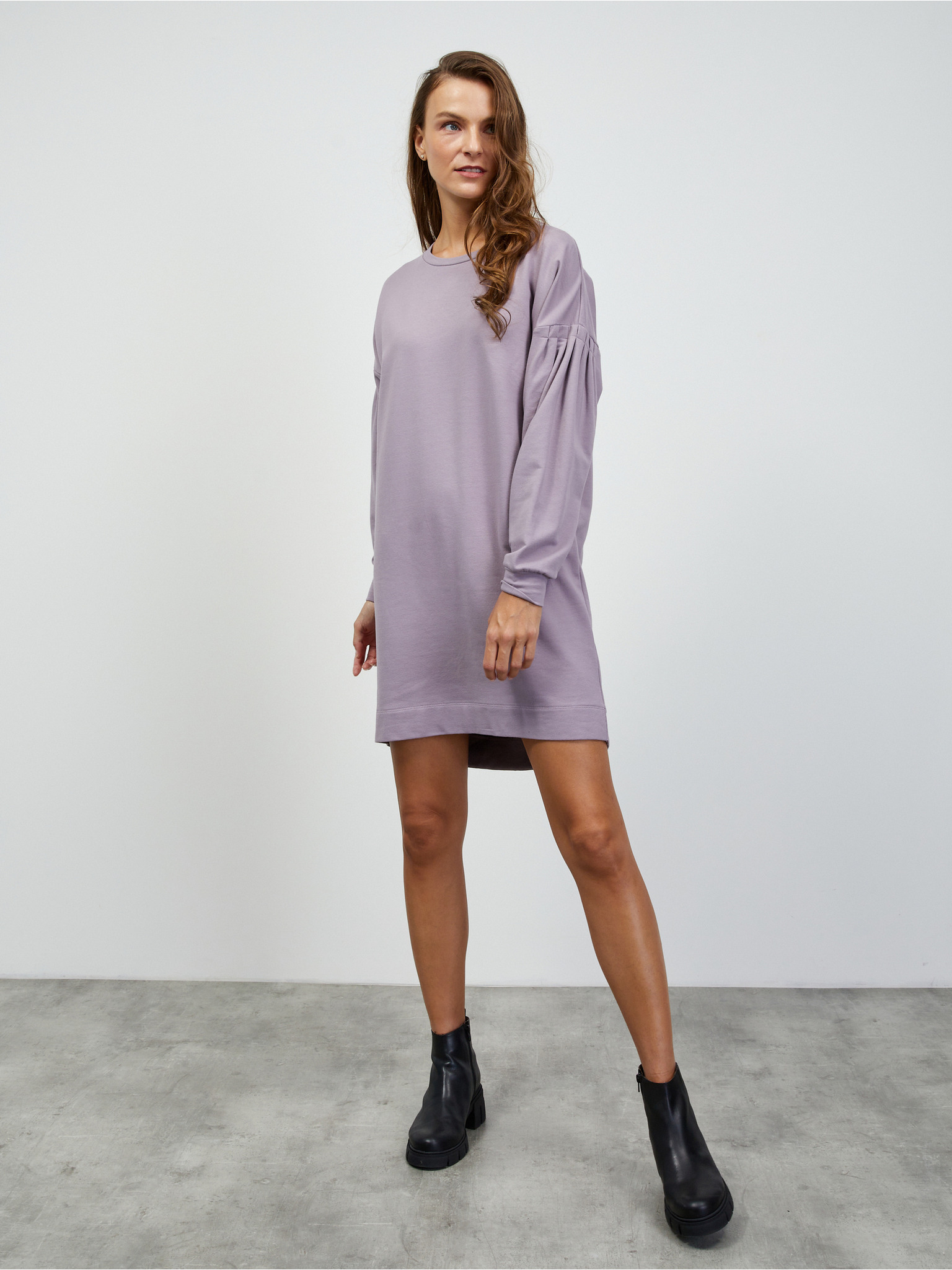 Svetlo vijoličasta ženska puloverska midi obleka z dodatkom volne O