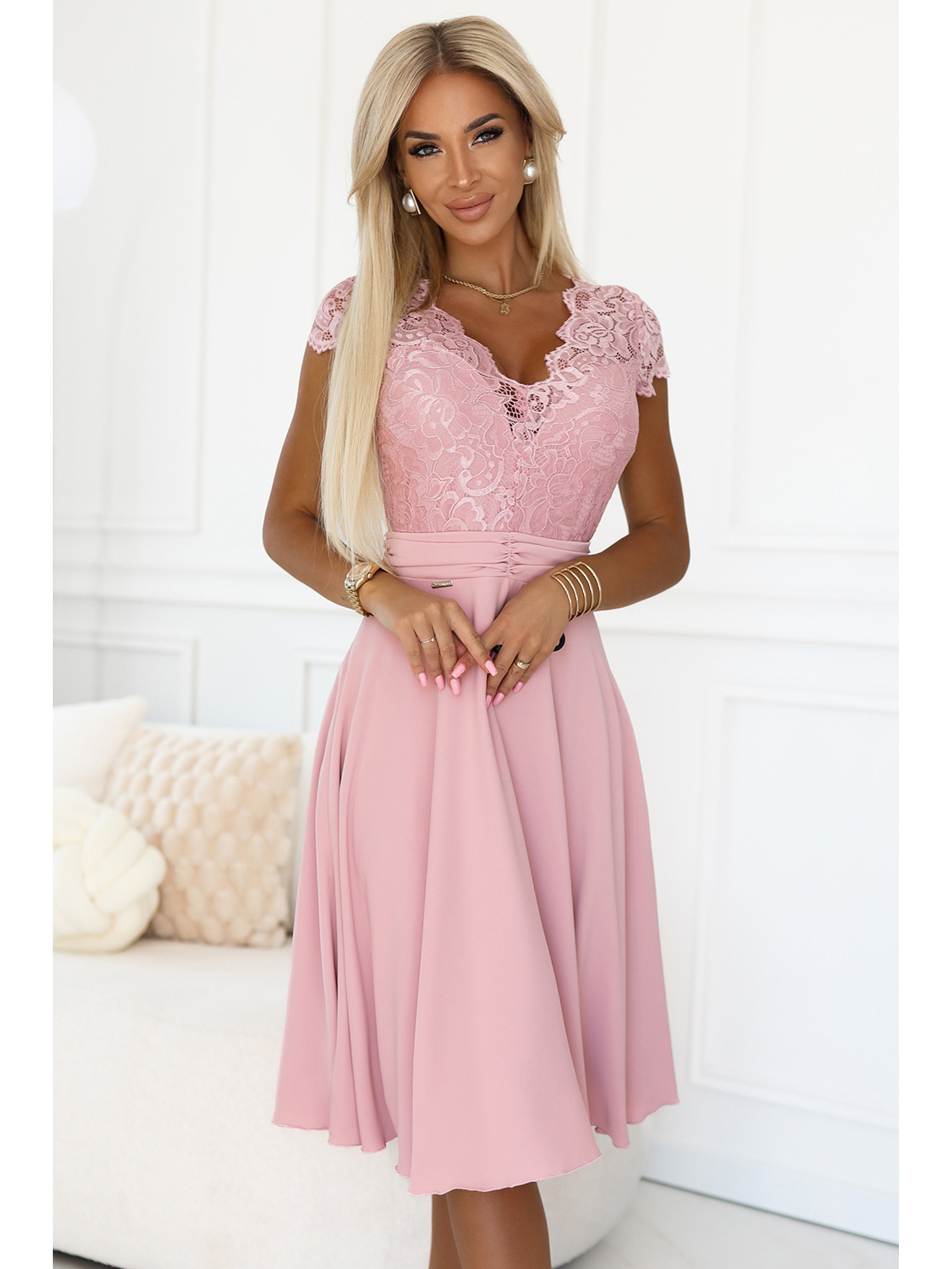 Čipkasta obleka z izrezom - pastelno rožnata Numoco