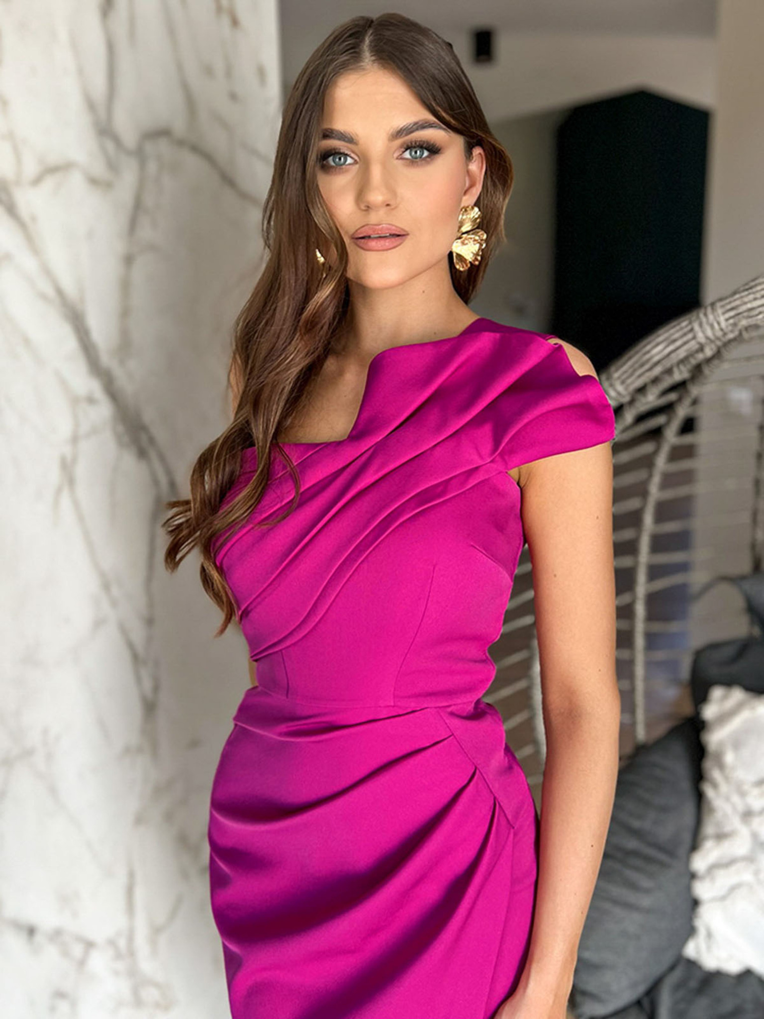 Obleka z razmaknjenim izrezom - fuksija z bleščicami Numoco SCARLETT