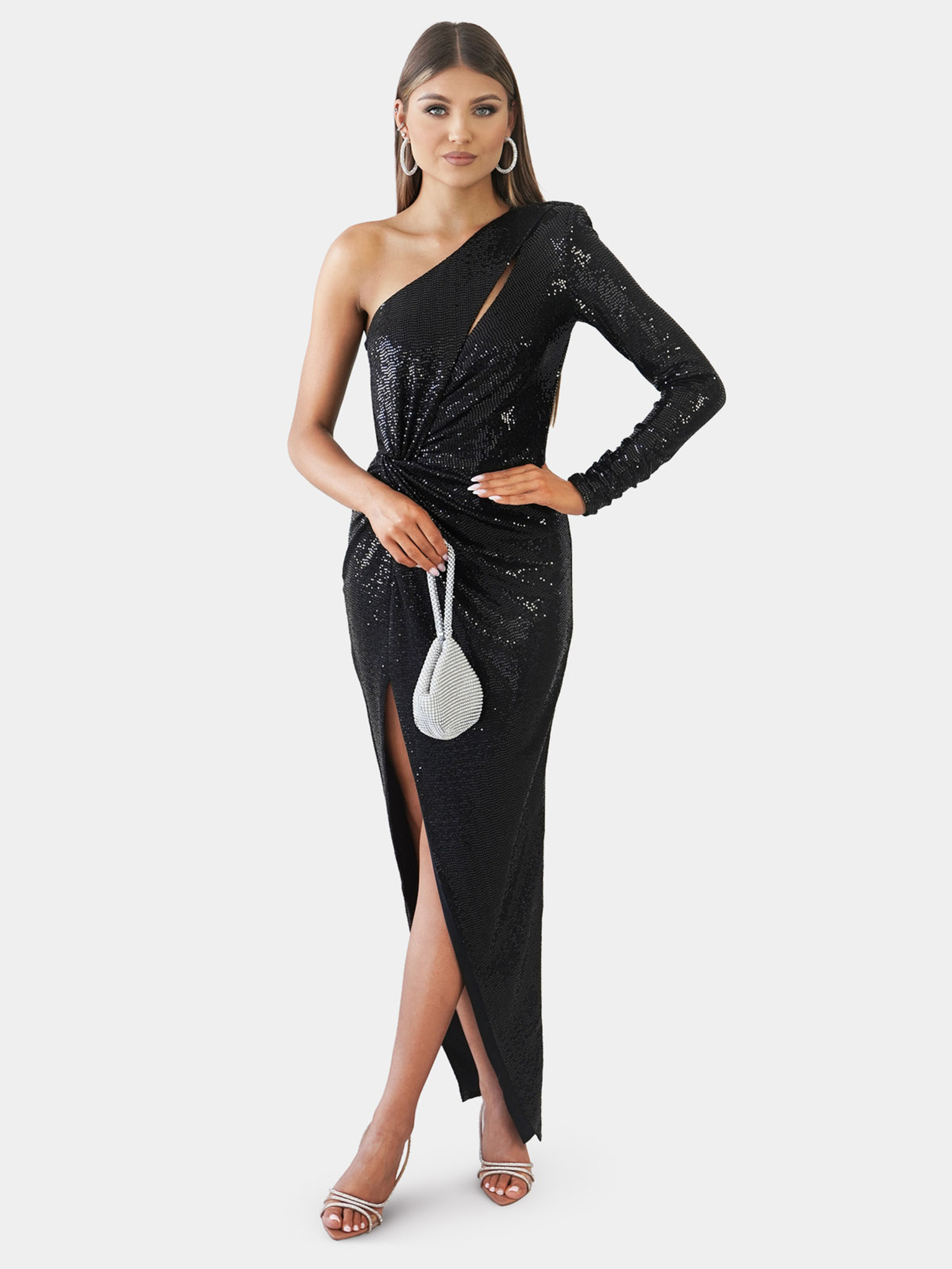 Bleščeče maxi obleke na eno ramo z asimetričnimi rokavi in razporkom - črne