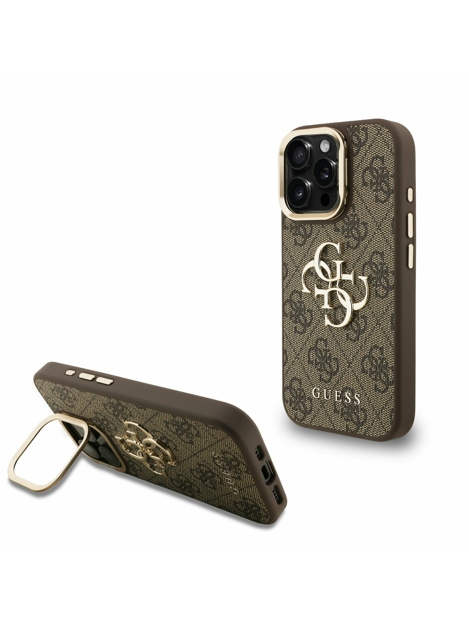 Guess PU 4G Strass Triangle Logo Stand Camera Frame MagSafe Zadnji pokrov za iPhone 16 Pro Brown