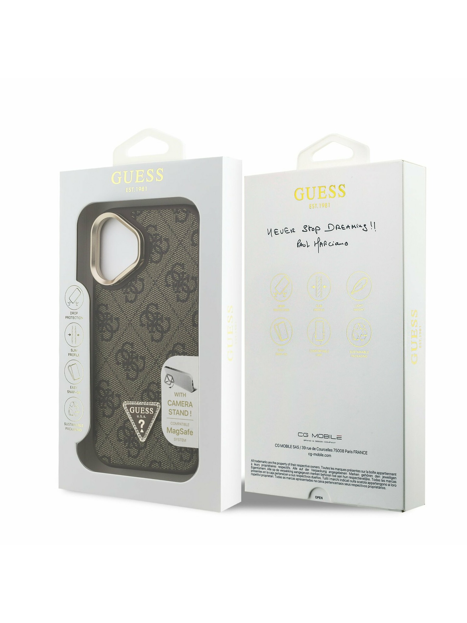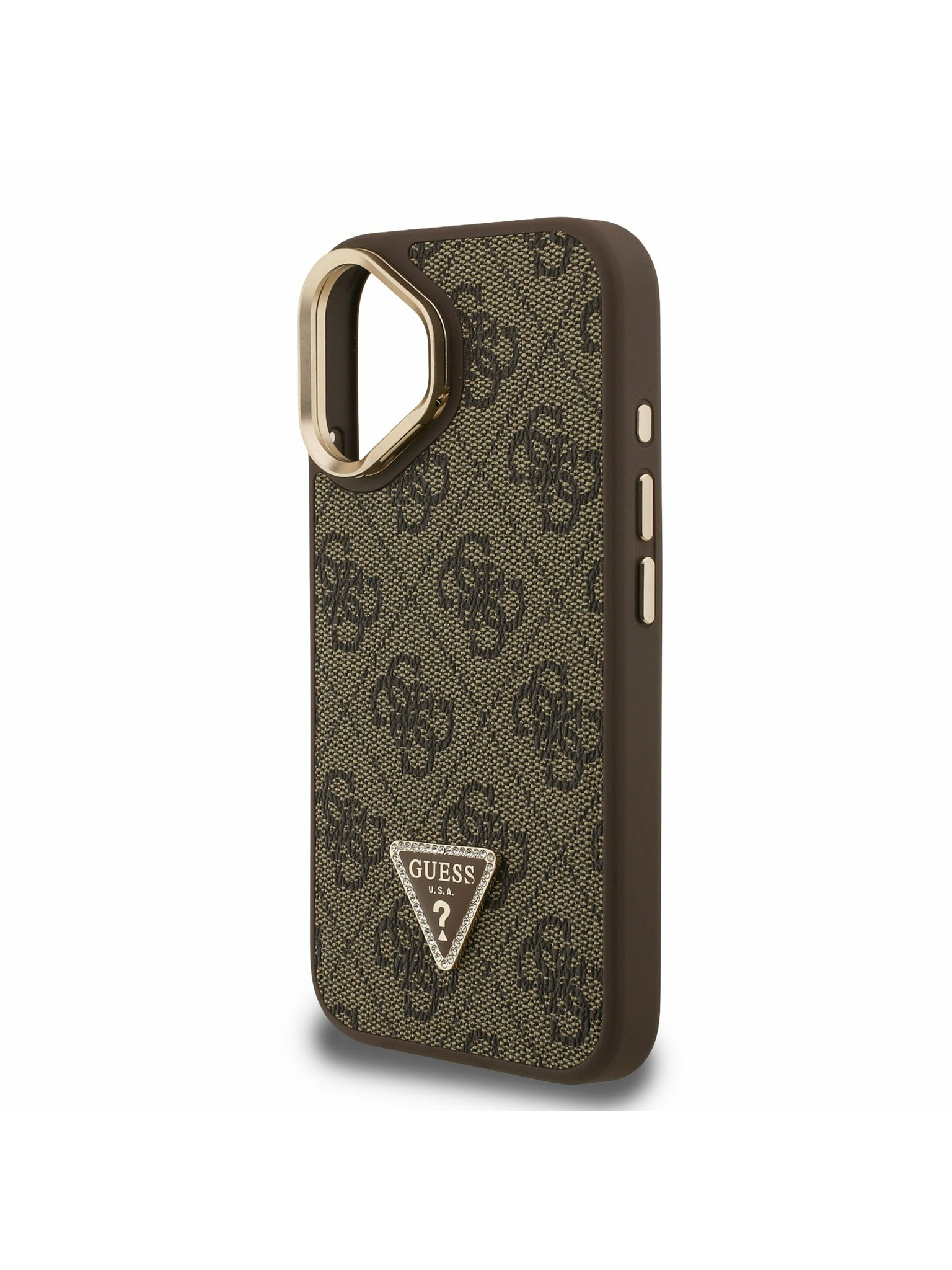 Guess PU 4G Strass Triangle Logo Stojalo Camera Frame MagSafe Zadnji pokrov za iPhone 14 Rjava