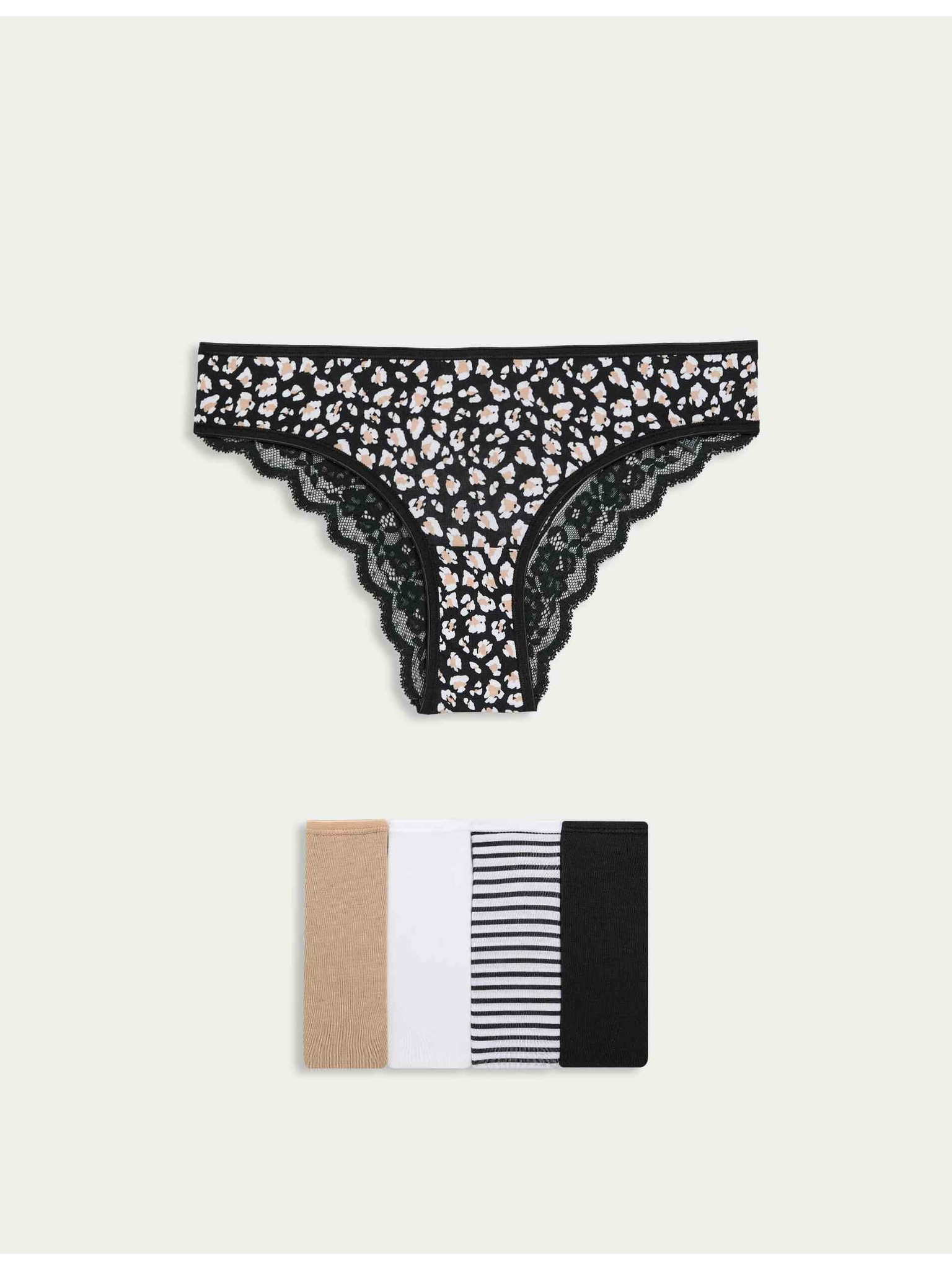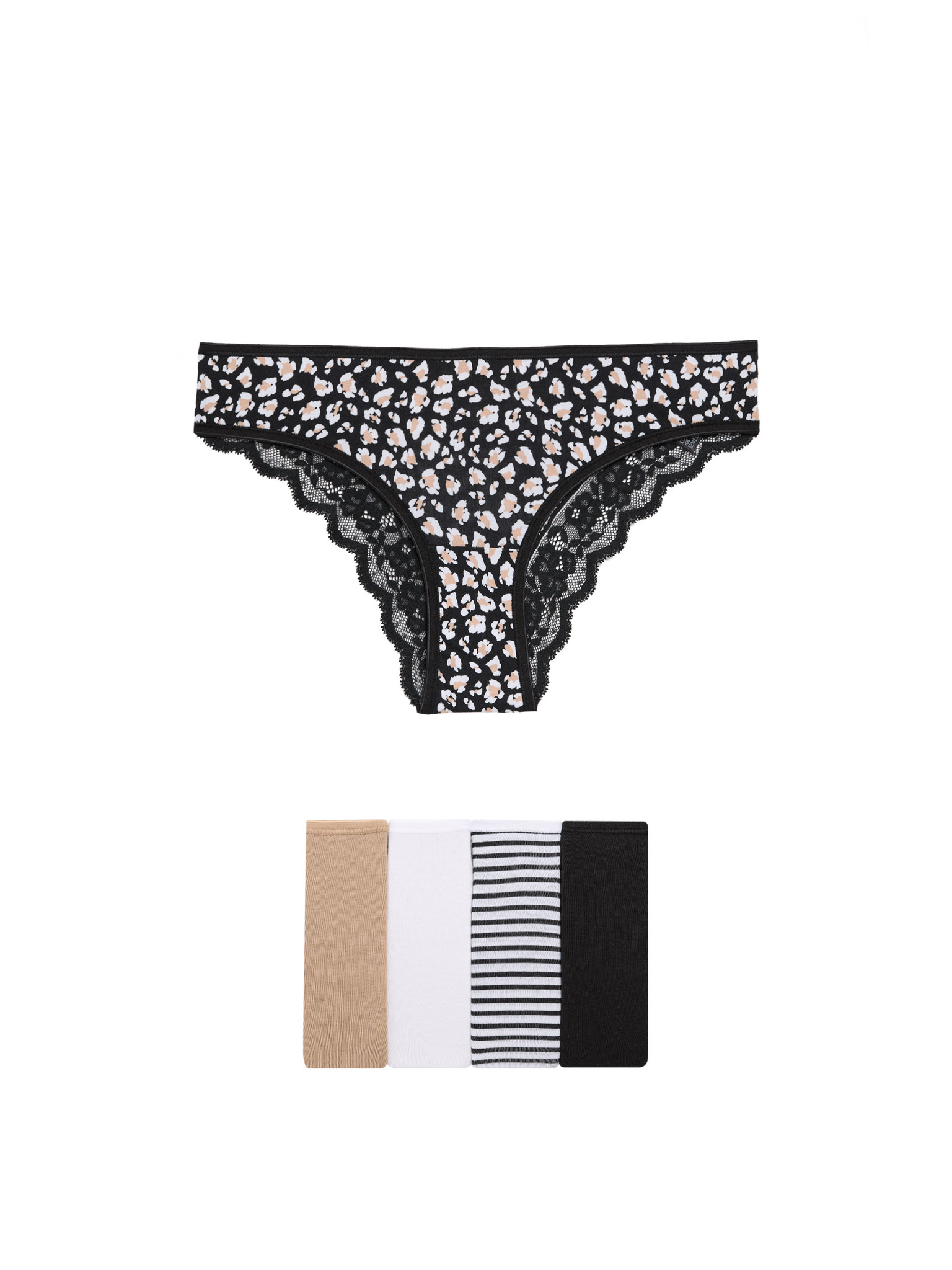 • Sestava: Paketi 1, 3 in 4 – 61 % bombaž, 30 % poliamid in 9 % elastan lycra® (brez dekoracije); Paketi 2 in 5 – 69 % bombaž, 18 % poliamid, 8 % elastan lycra® in 5 % viskoza; Vložek (spodnje perilo) – 100 % bombaž