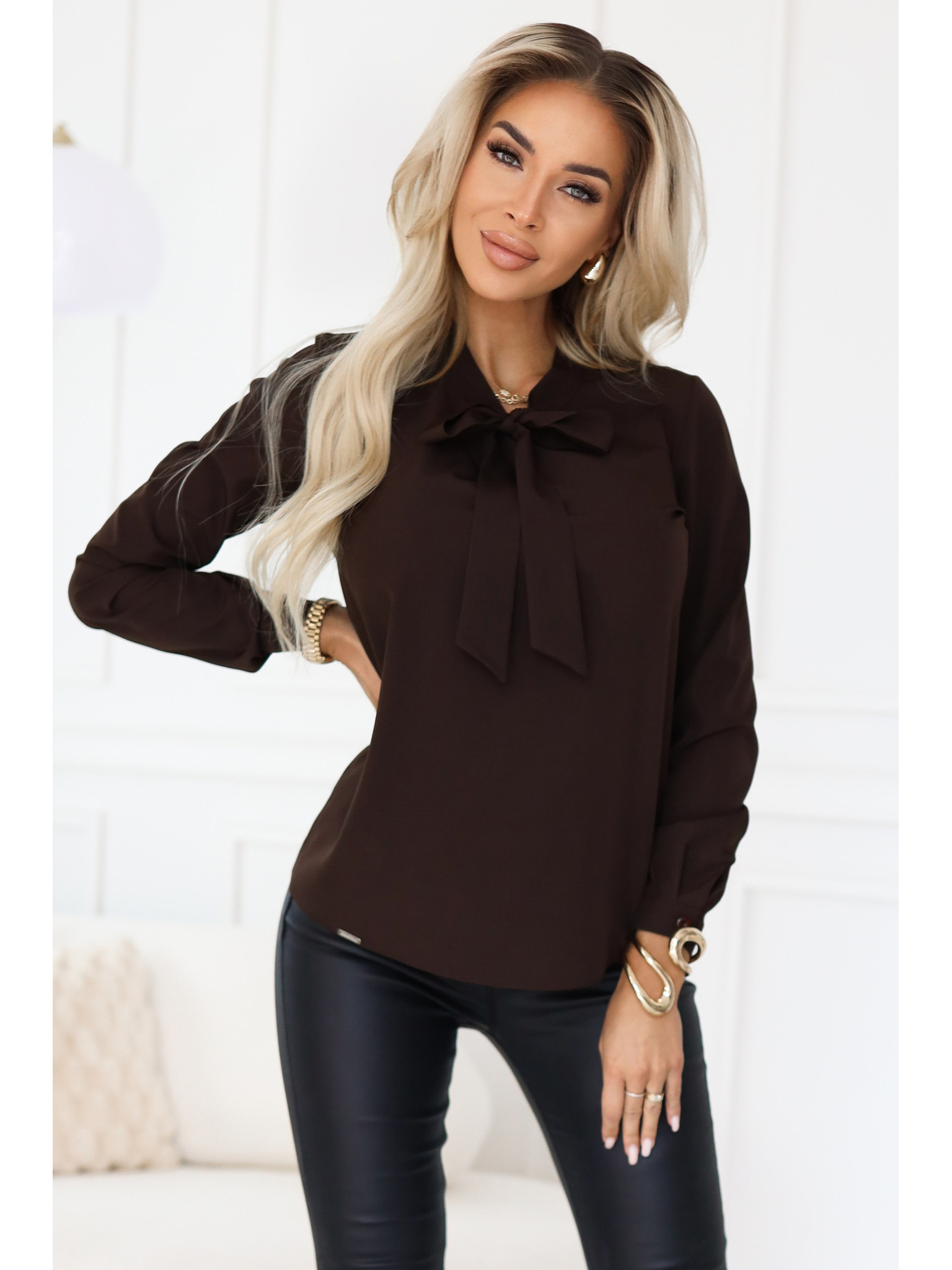 Rjava ženska bluza z dolgimi rokavi s kravato in gumbi Numoco