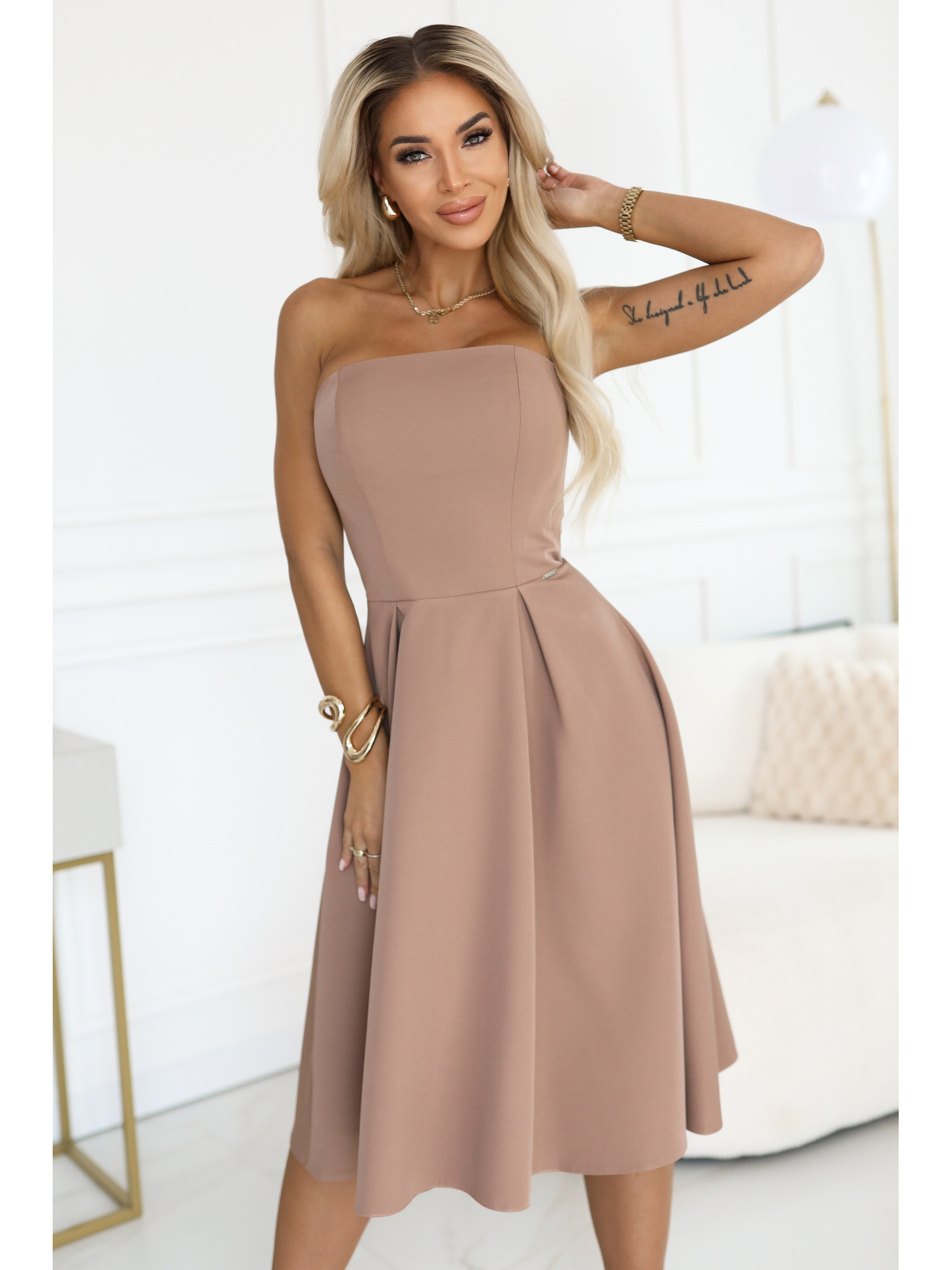 Obleka z raztegnjenim izrezom - bež Numoco SCARLETT