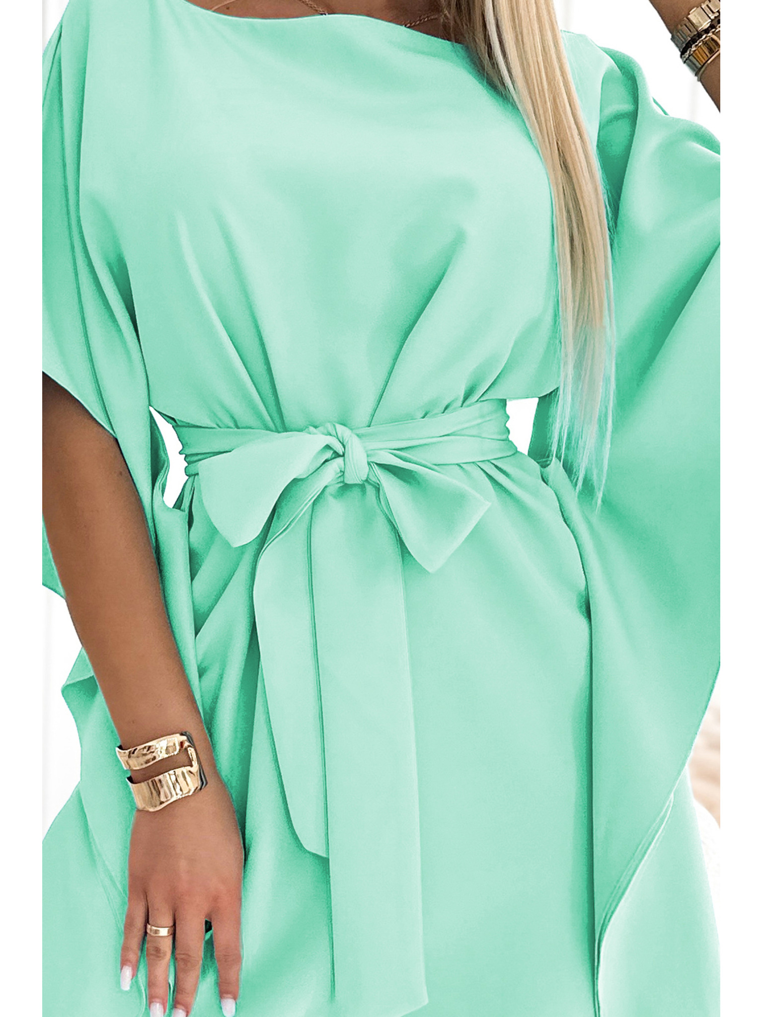 Obleka z daljšim hrbtom, izrezom in pasom - zelena Numoco MAYA