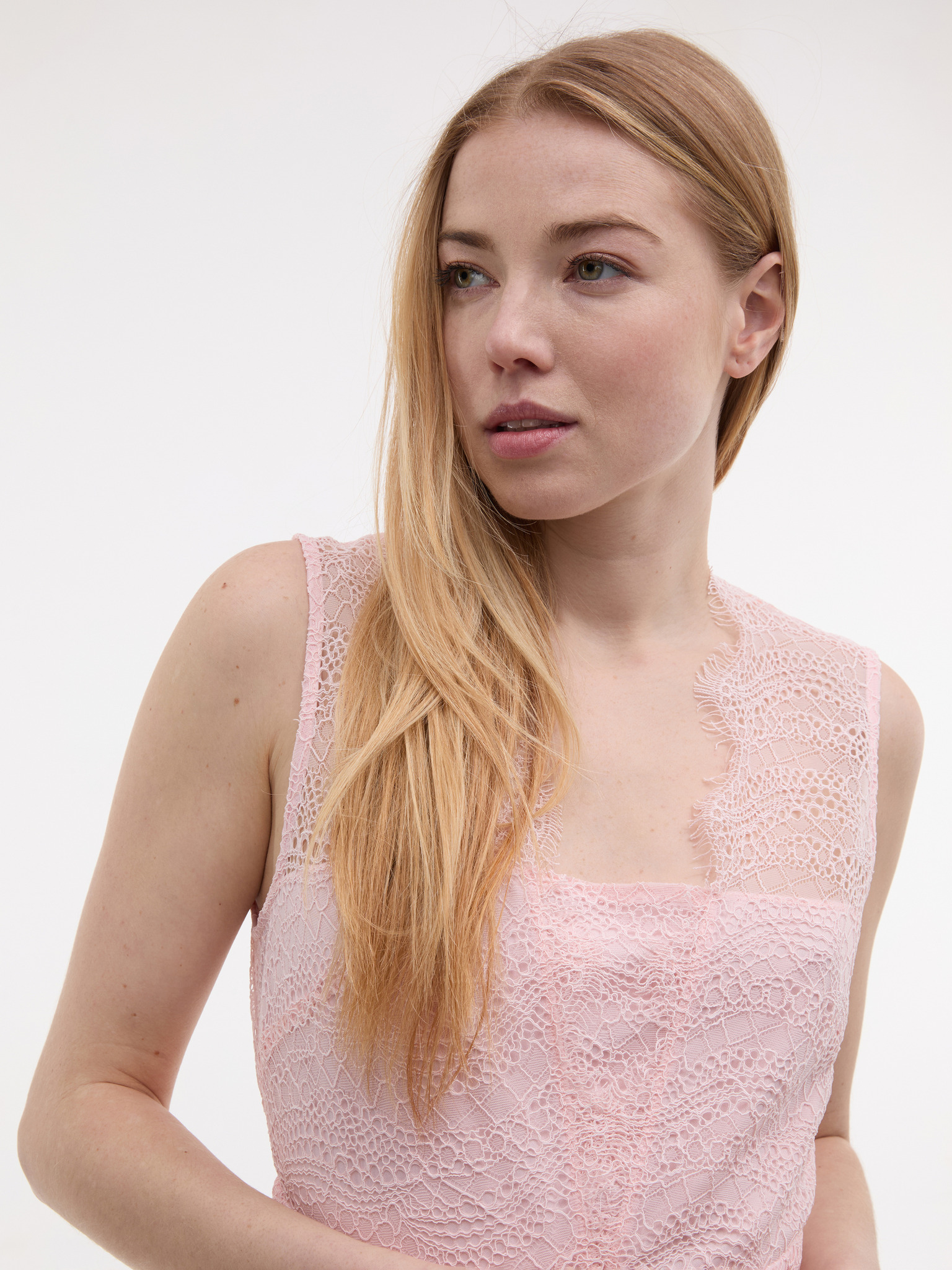 Čipkasta obleka z izrezom - pastelno rožnata Numoco