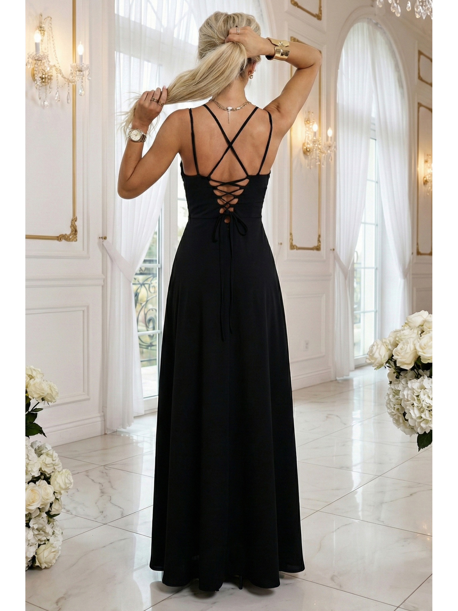 AMBER čipkaste, elegantne dolge obleke z izrezom in razporkom na nogavicah - črne