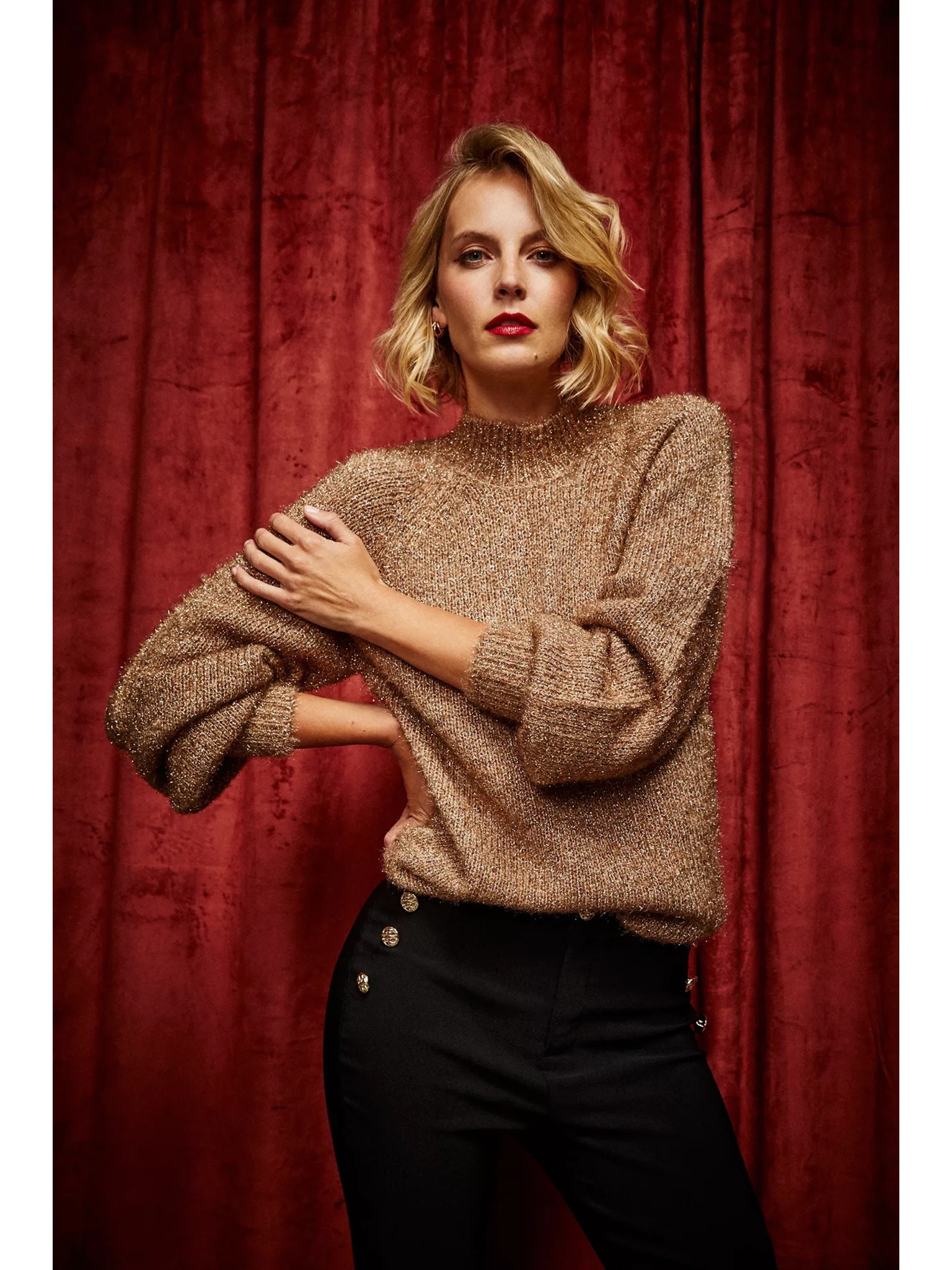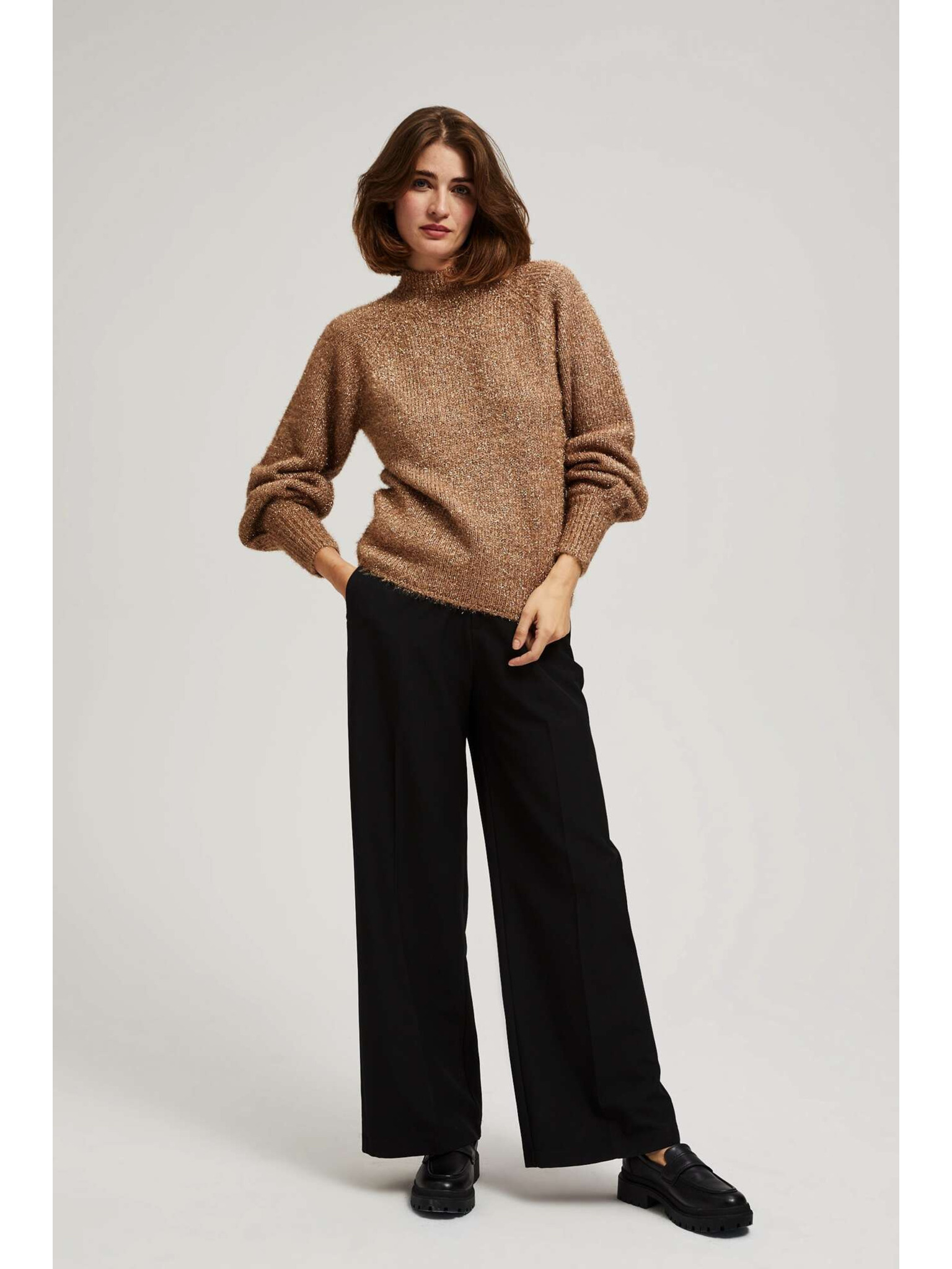 Béžev pulover z rolakom z metalnim thread-om Moodo