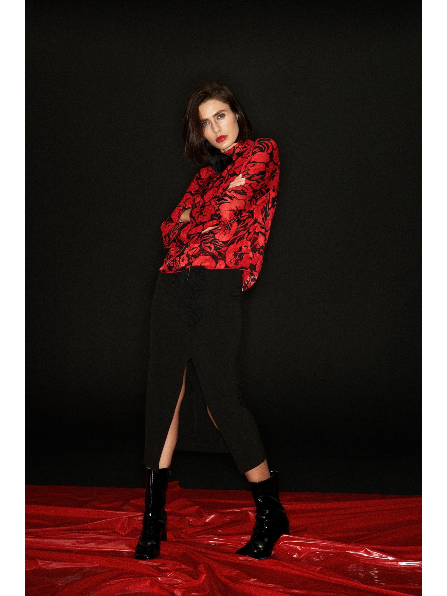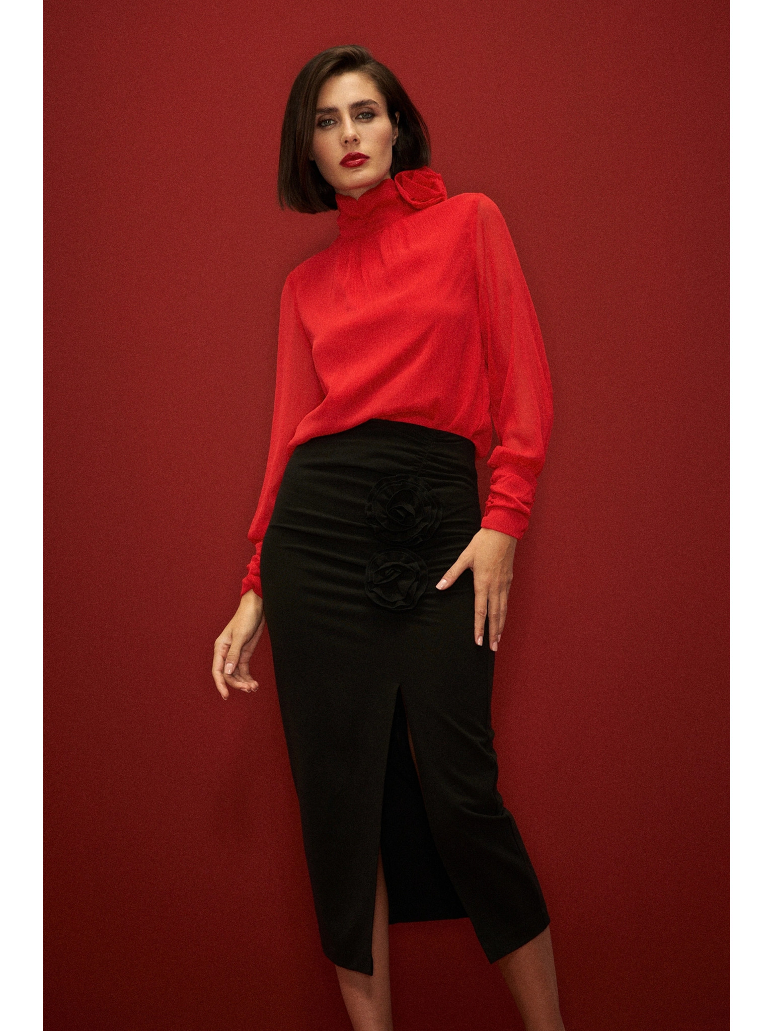 • mere modela: Model na fotografiji: višina - 174 cm, mere 85/62/91, velikost na fotografiji - zgornji del-S, spodnji del-S