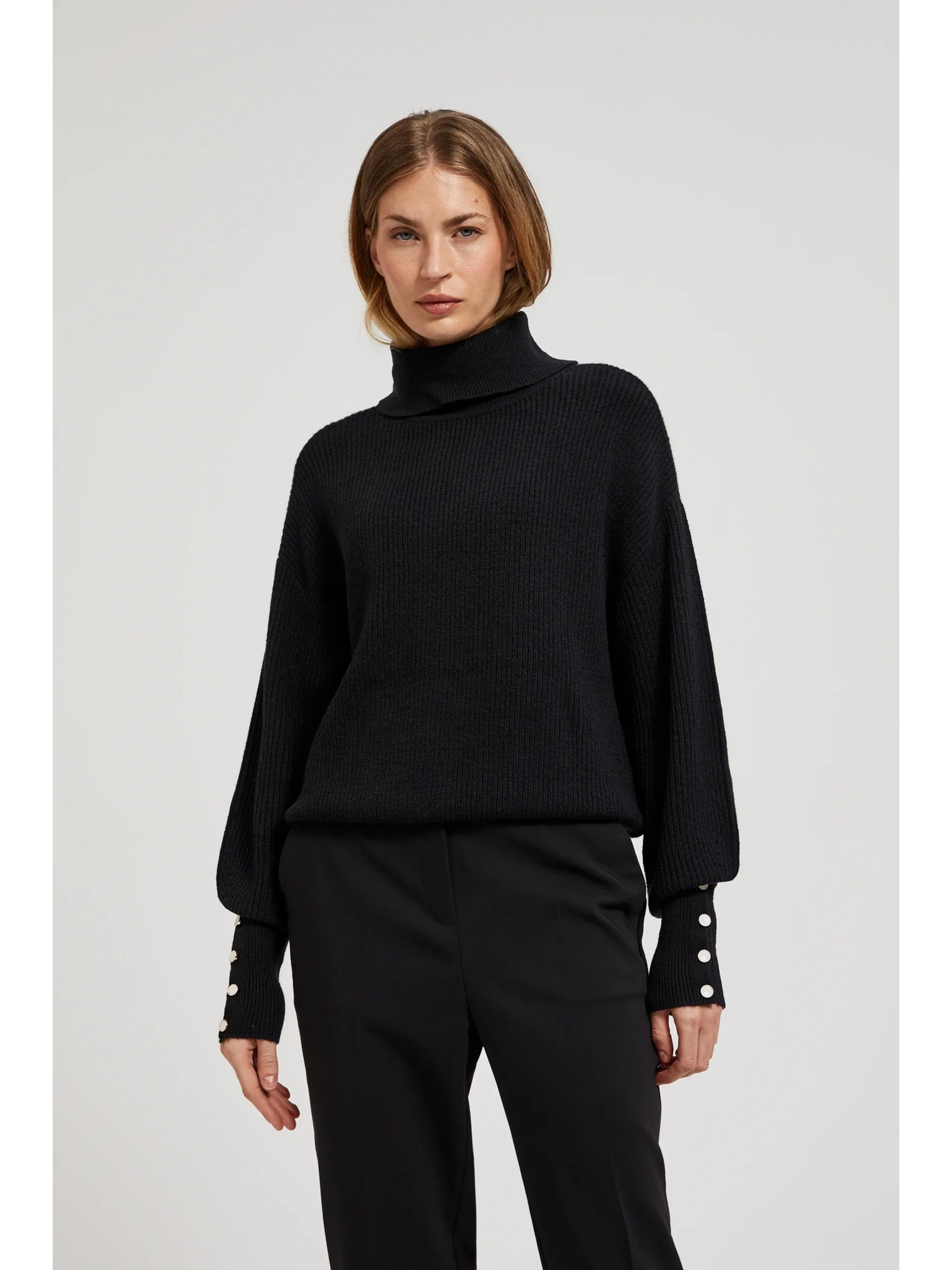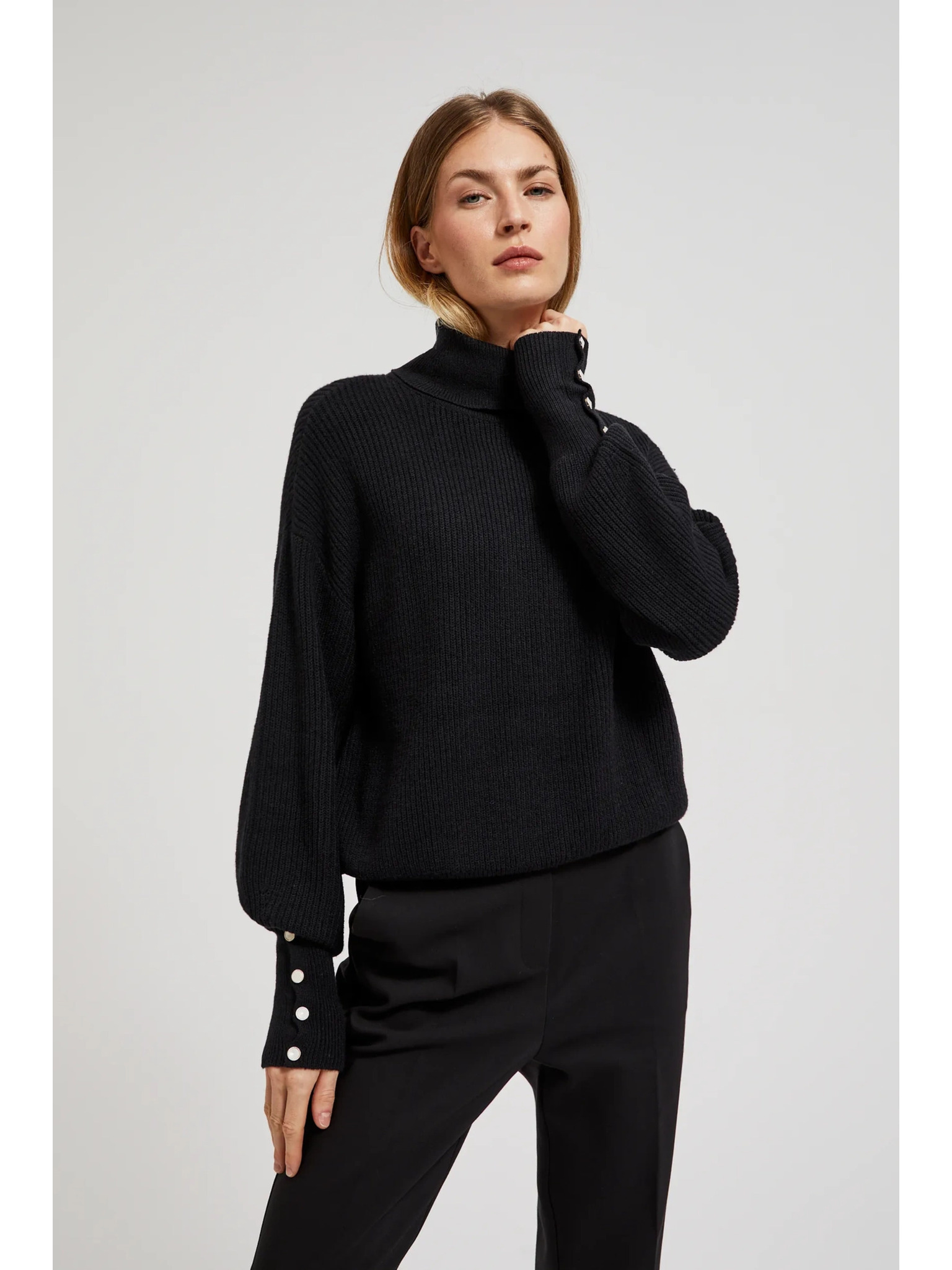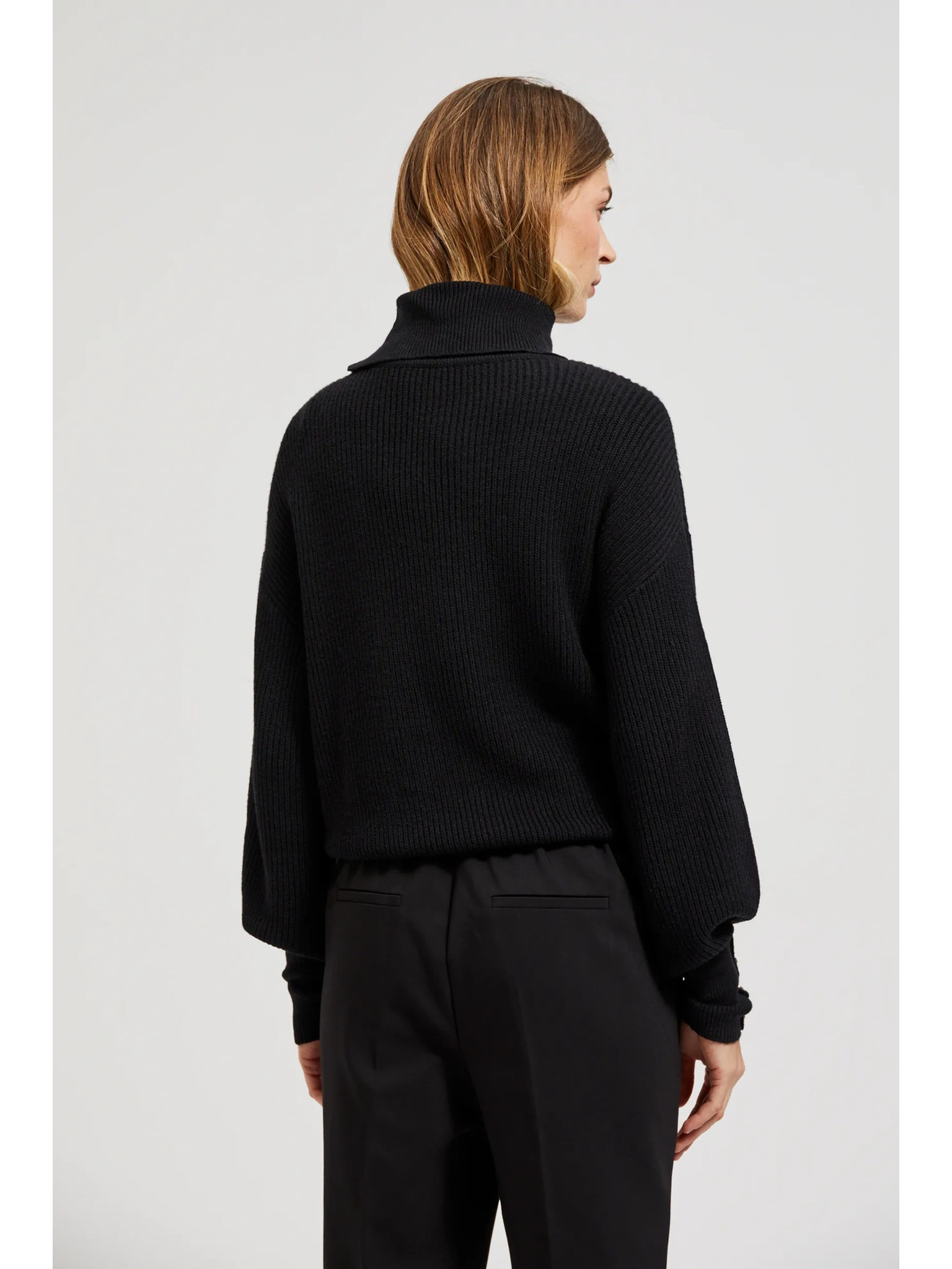 Črn pulover z visokim ovratnikom in napihnjeni rokavi Moodo