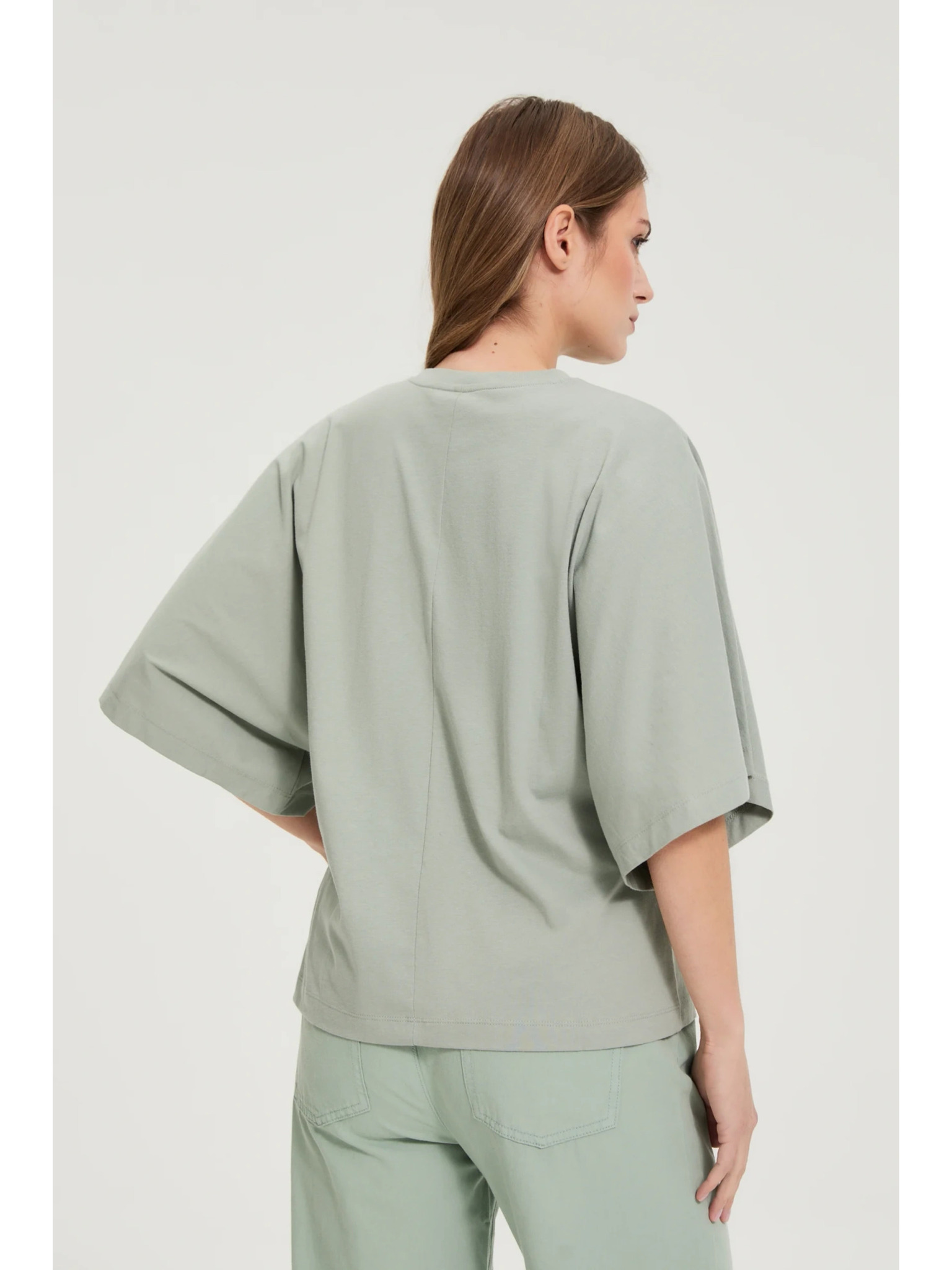 Bombažna bluza z V-izrezom olivno zelena Moodo