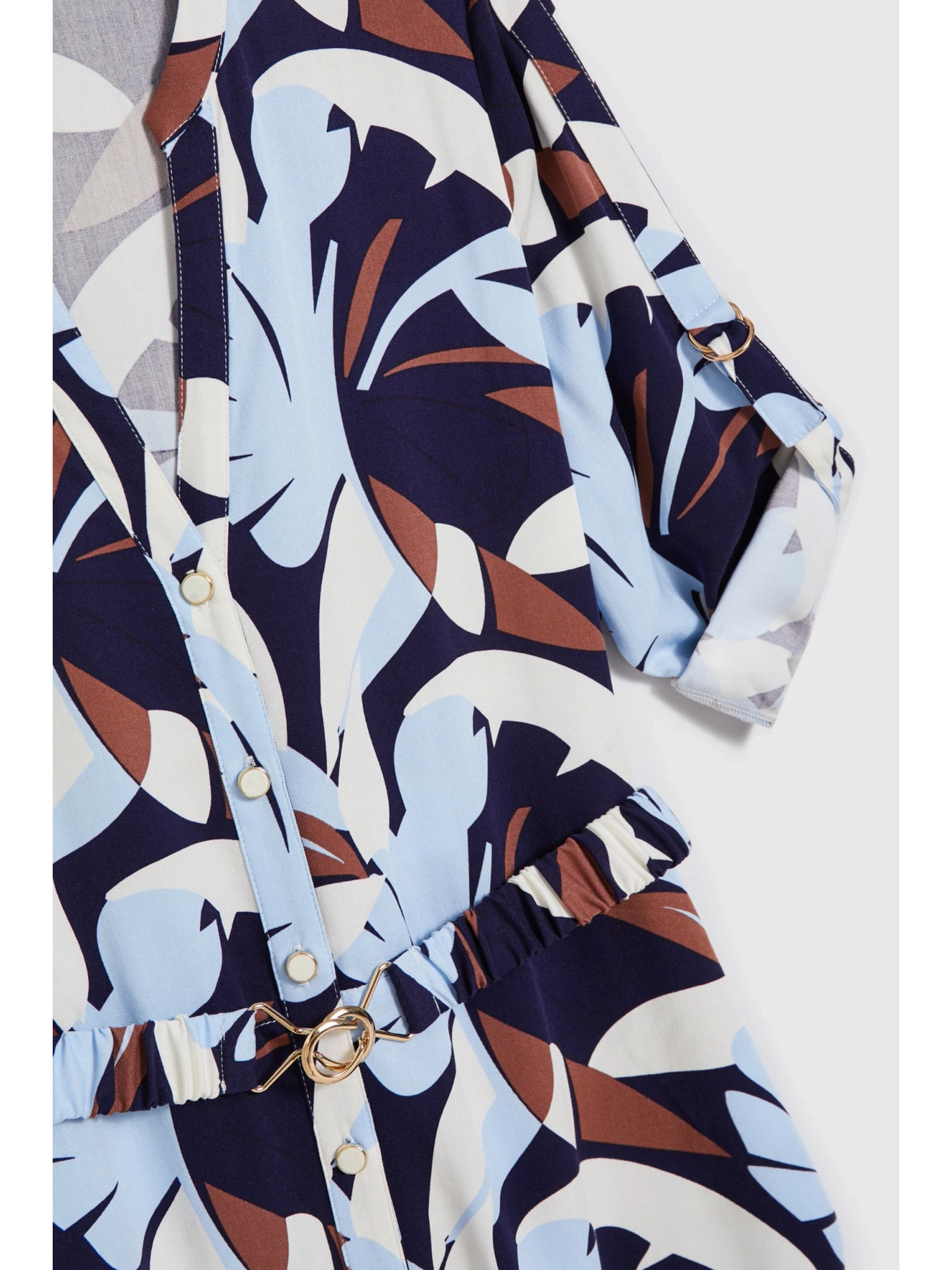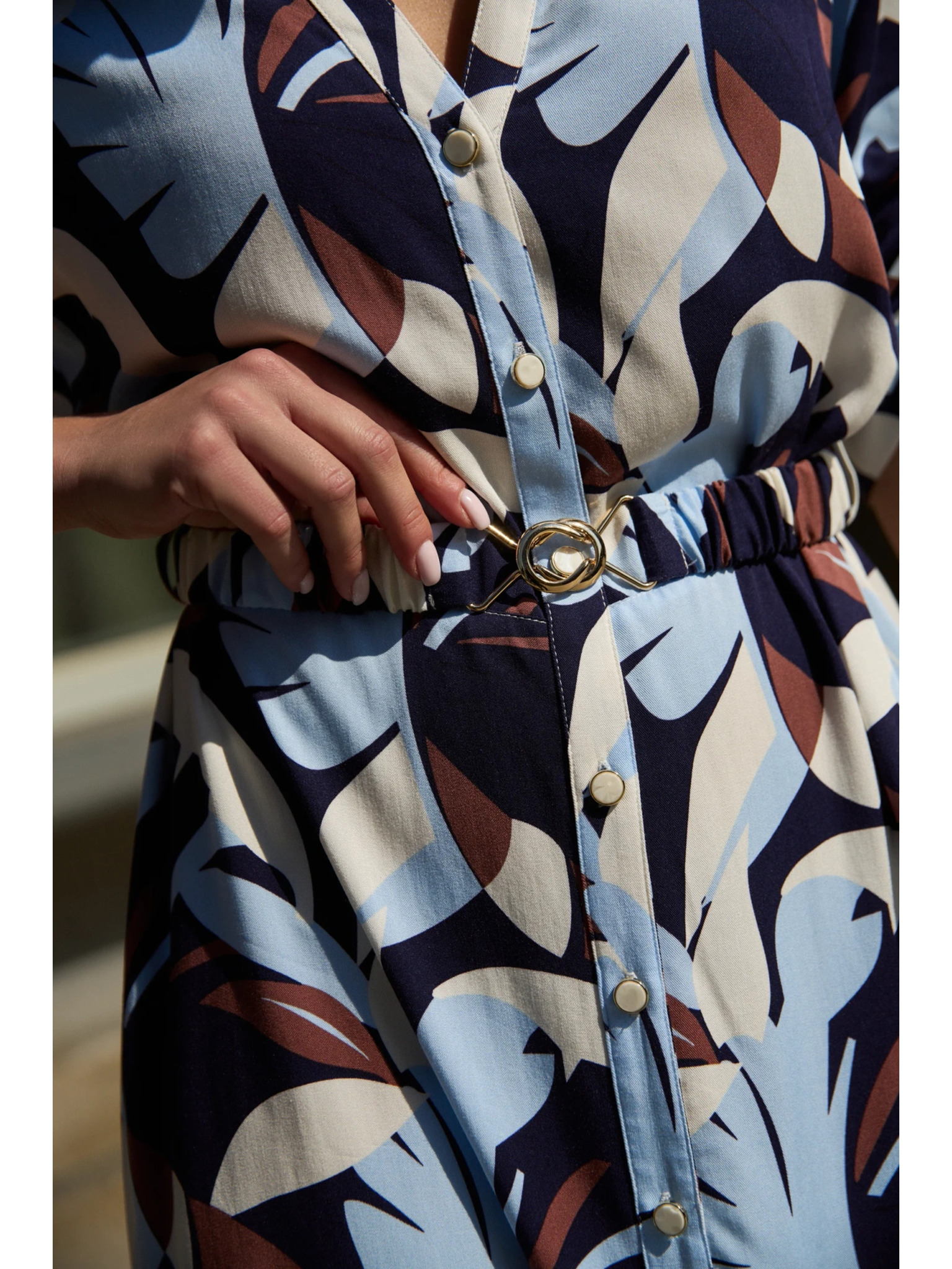 Bež obleka z geometrijskim vzorcem in nagubanim spodnjim delom Moodo