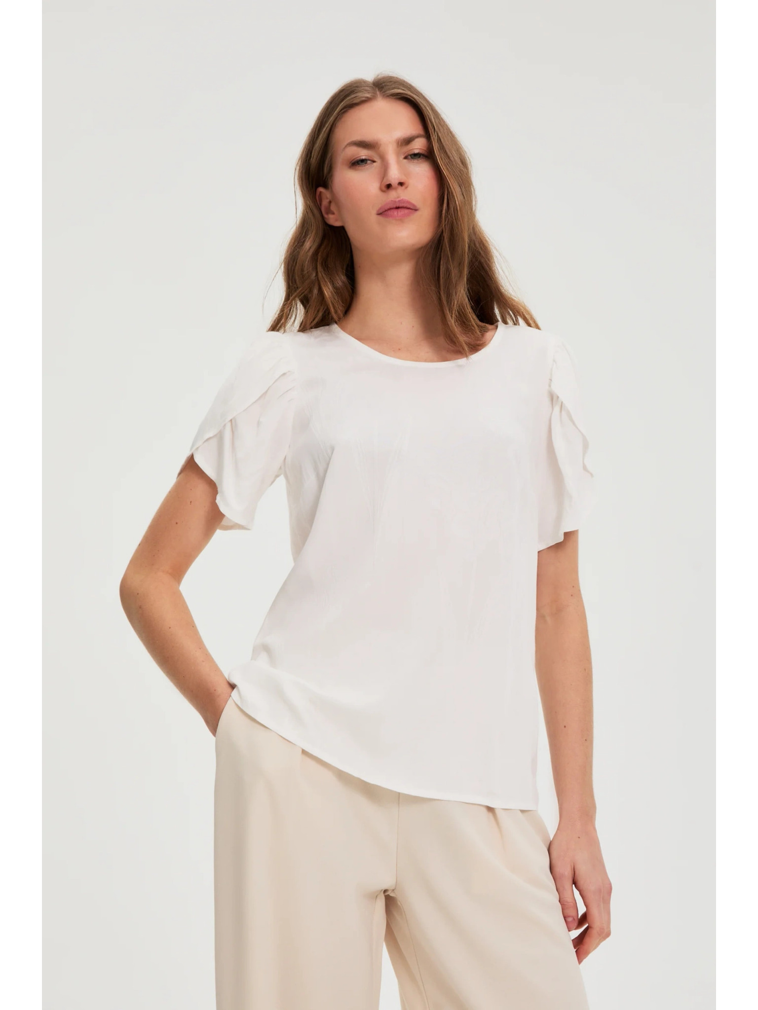 Bela bluza z zavihani rokavi Moodo