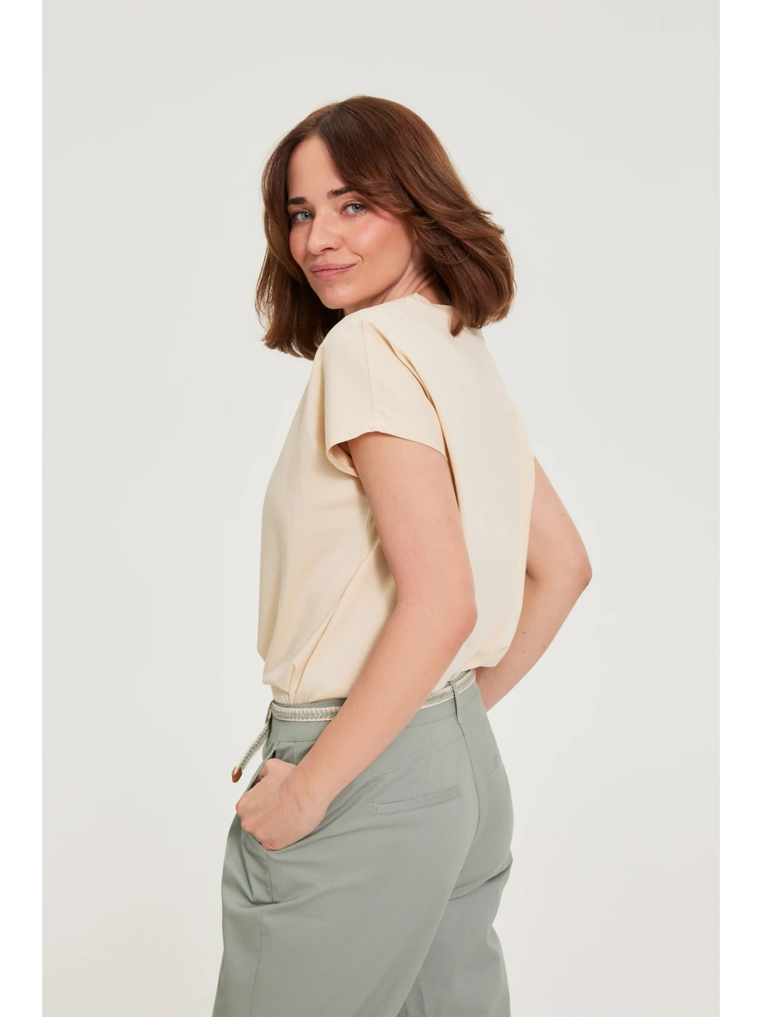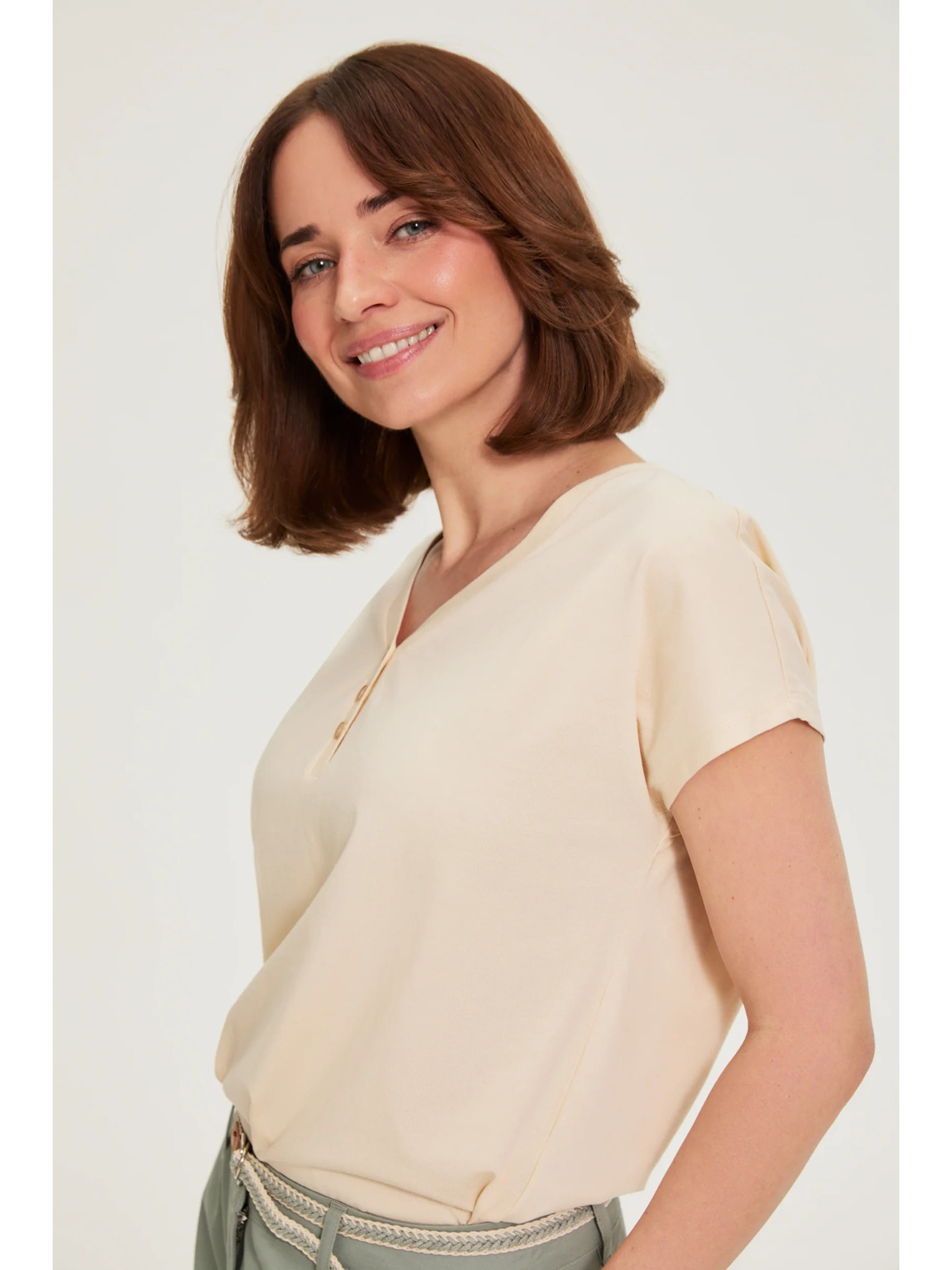 Srajca z V-izrezom in kratkimi rokavi, olivno zelena Moodo