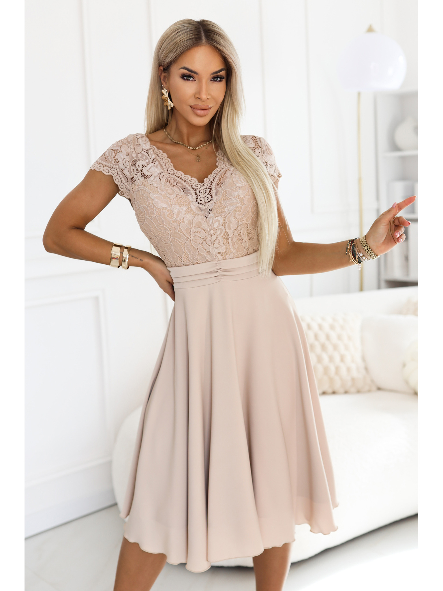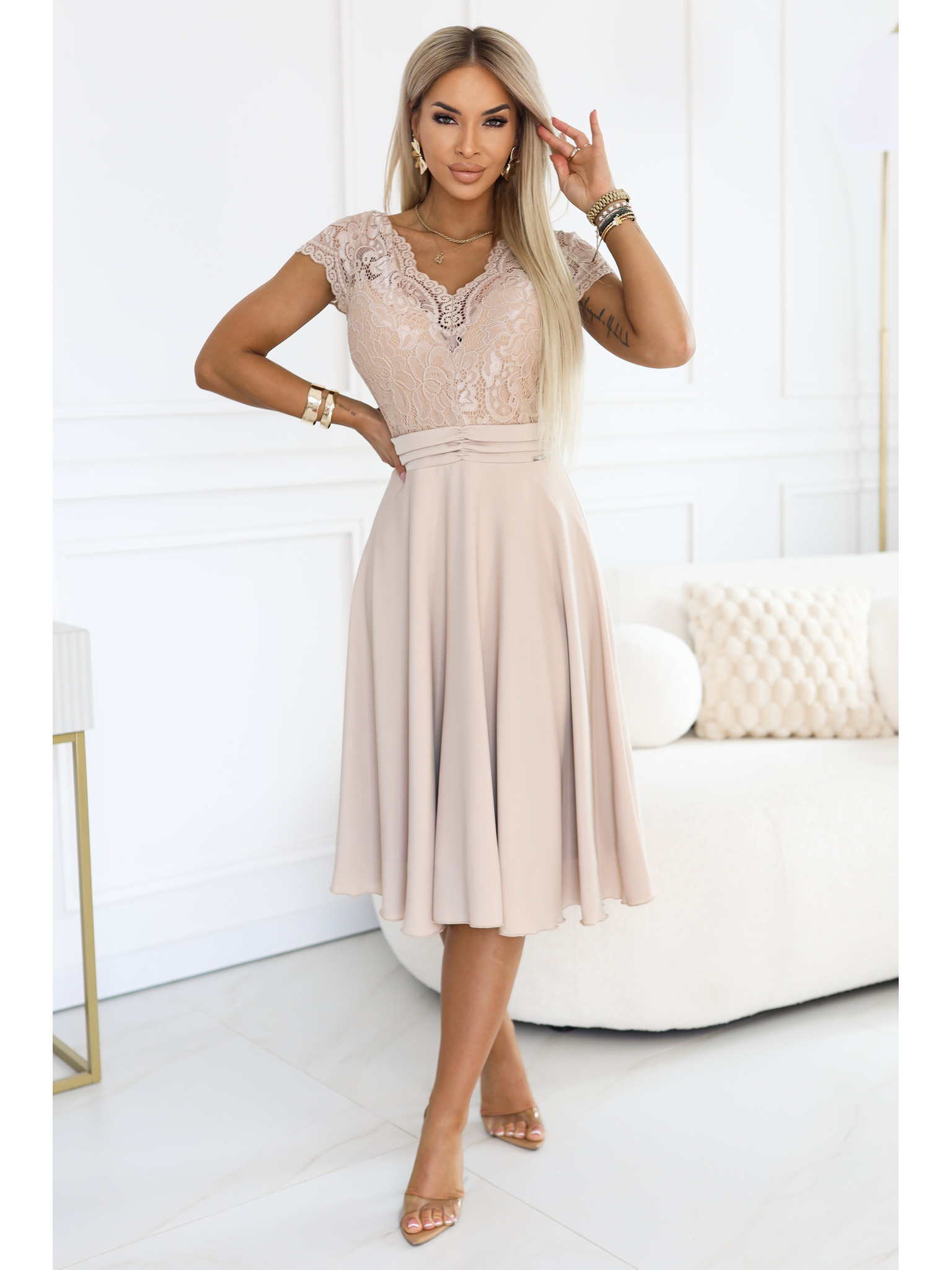 Obleka z izrezom in kratkimi rokavi - bež Numoco MATILDE
