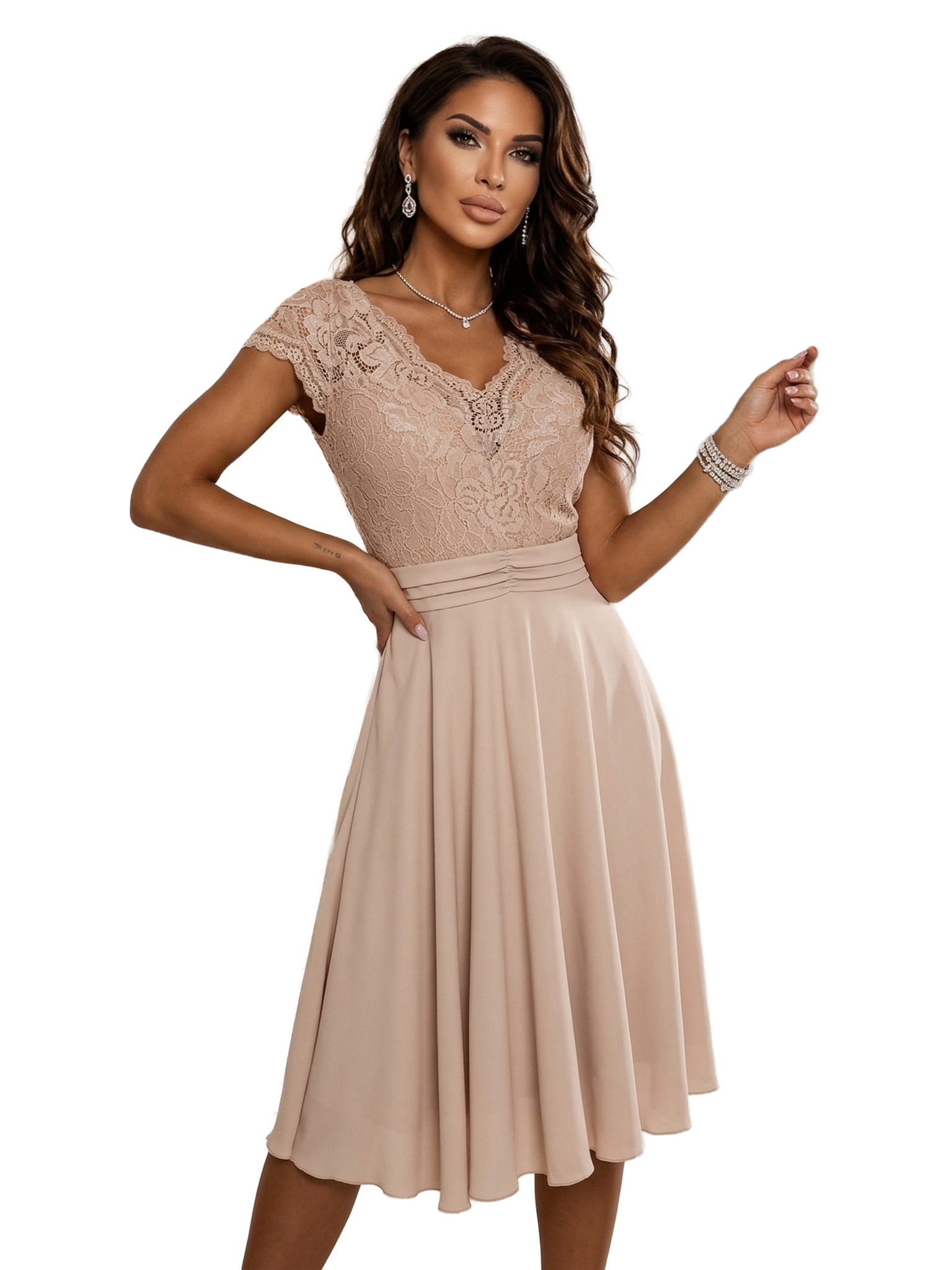 VIVIENNE midi obleke s stezniki in razširjenimi naramnicami za posebne priložnosti - bež