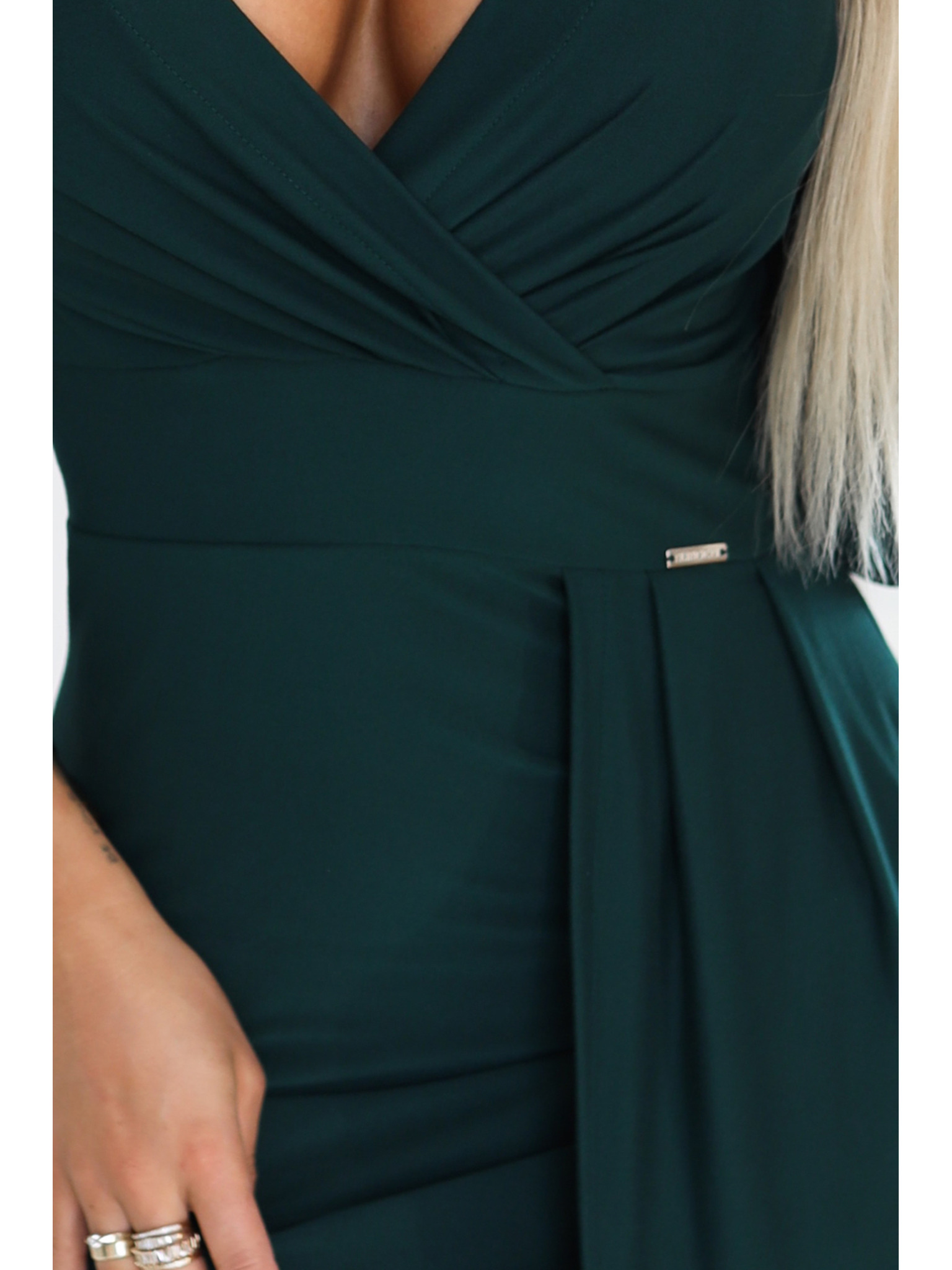 IRINA osupljive dolge šaty z brokatom, izrezom V in razporkom - stekleničasto zelene